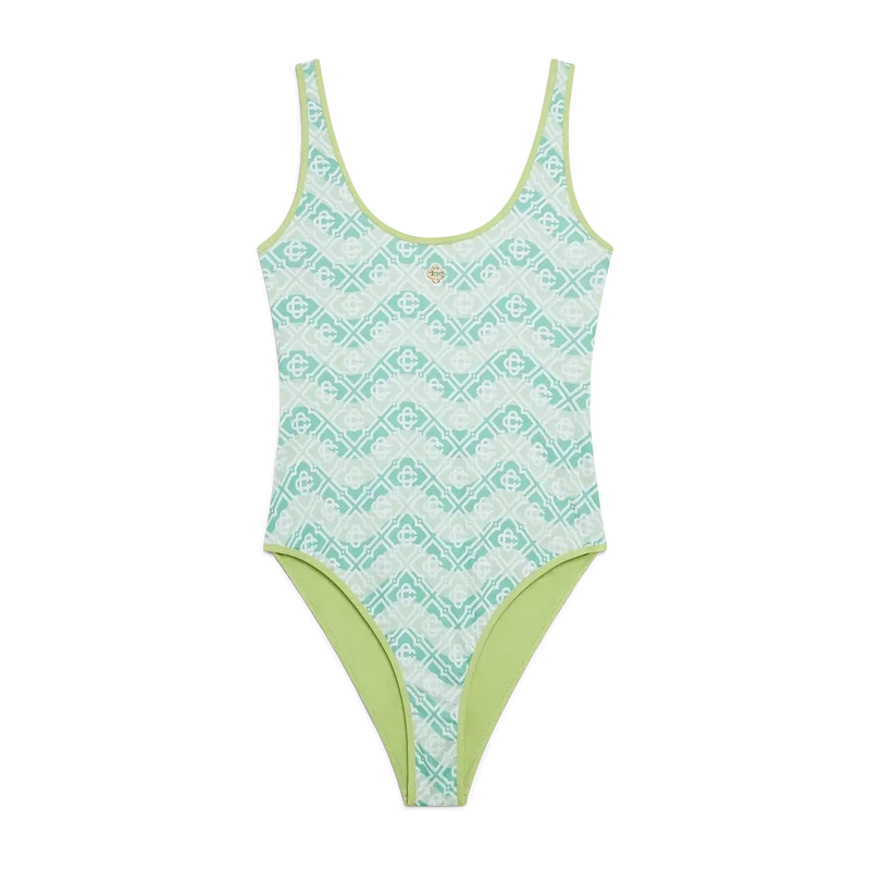 Badedrakten med bølget monogramtrykk har et raffinert design med husets monogrammønster på en bakgrunn inspirert av Memphis-bølgen. Fullført med husets signaturdiamantlogo på brystet, høyt kuttede ben, rund hals, dyp rund rygg og kontrastkantdetaljer.