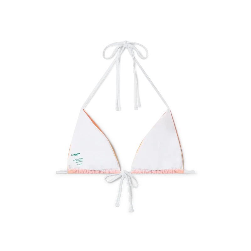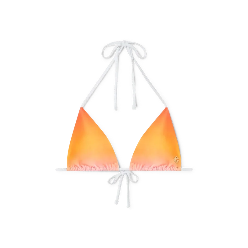 Gradient-bikinitoppen er et trykt trekantet design laget av et polyestermiksstoff, med sesongens gradientfarger. Fargepaletten for denne kolleksjonen er lys og idealistisk, og understreker de eteriske temaene som er kjernen i vårt merke. Fullført med kontrastfargede hvite snørebånd i nakken og på ryggen, avtakbare bøyleinnlegg og husets signatur, den gullbelagte sammenflettede CC-niten på venstre bøyle – dette plagget er designet for å brukes sammen med den matchende bikinibuksen.