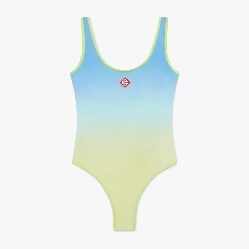 Den blå og gule badedrakten med fargegradient er en mønstret heldrakt laget av pustende stoff, med sesongens fargegradientmønster. Den er utstyrt med husets karakteristiske diamantlogo foran, rund hals, høyt kuttede ben, fôr og lavt kuttet rund rygg.