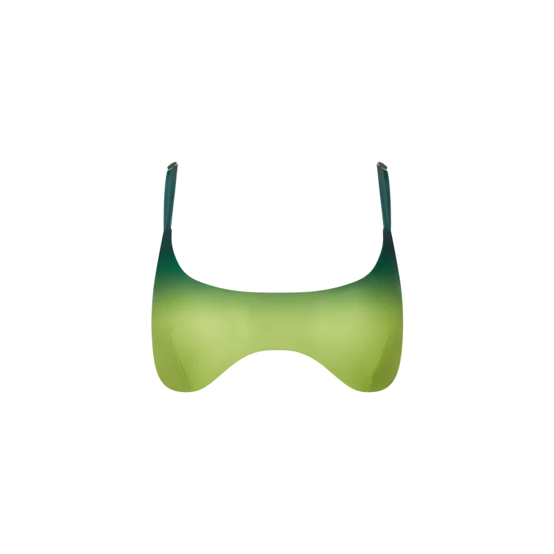 Gradient-bikinitoppen har et trykt mønster og er laget av teknisk badestoff. Den har kontrastfargede hvite snørebånd i nakken og på ryggen, avtakbare koppstøtter og husets karakteristiske gullbelagte, sammenflettede CC-nitte på venstre kopp. Dette plagget er designet for å brukes sammen med den matchende bikinibuksen.