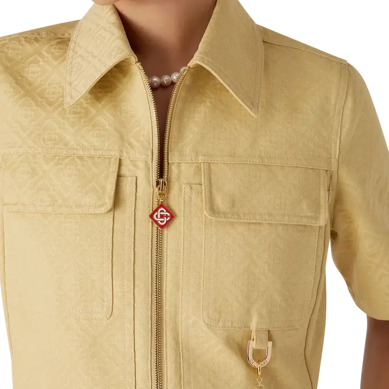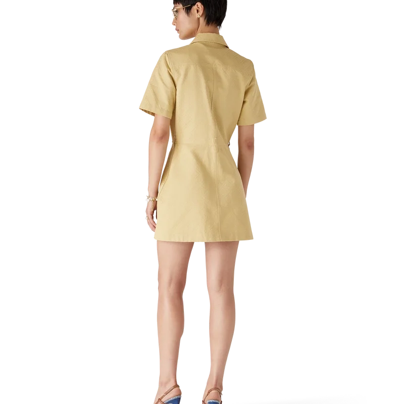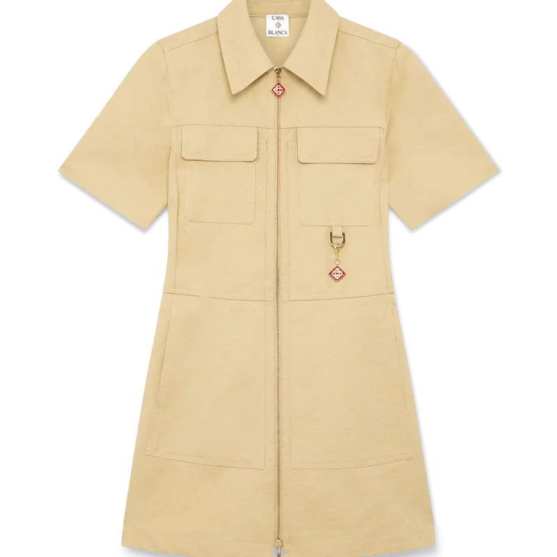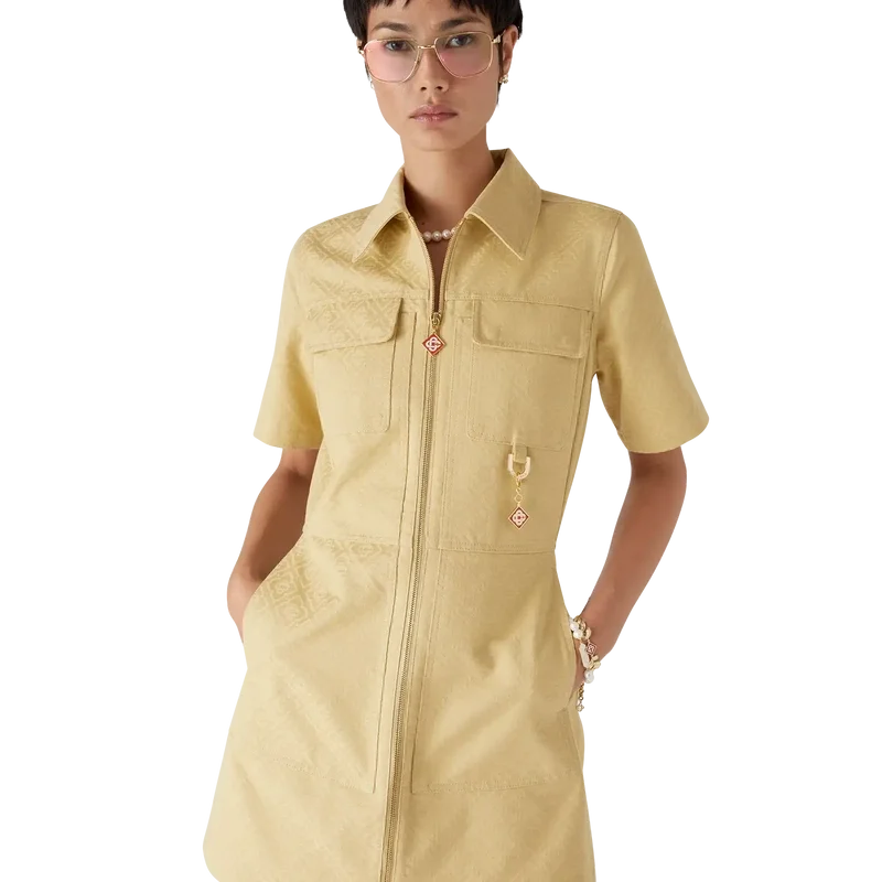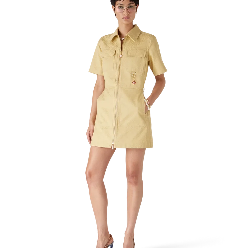 Bomullsmonogram-jacquardkjolen er en kortærmet minikjole i A-linje, laget av bomullsmonogram-jacquardstoff. Den har spisskrage, glidelås foran med husets karakteristiske diamantlogo på glidelåstappen, påsydde lommer og lommer med klaff.
