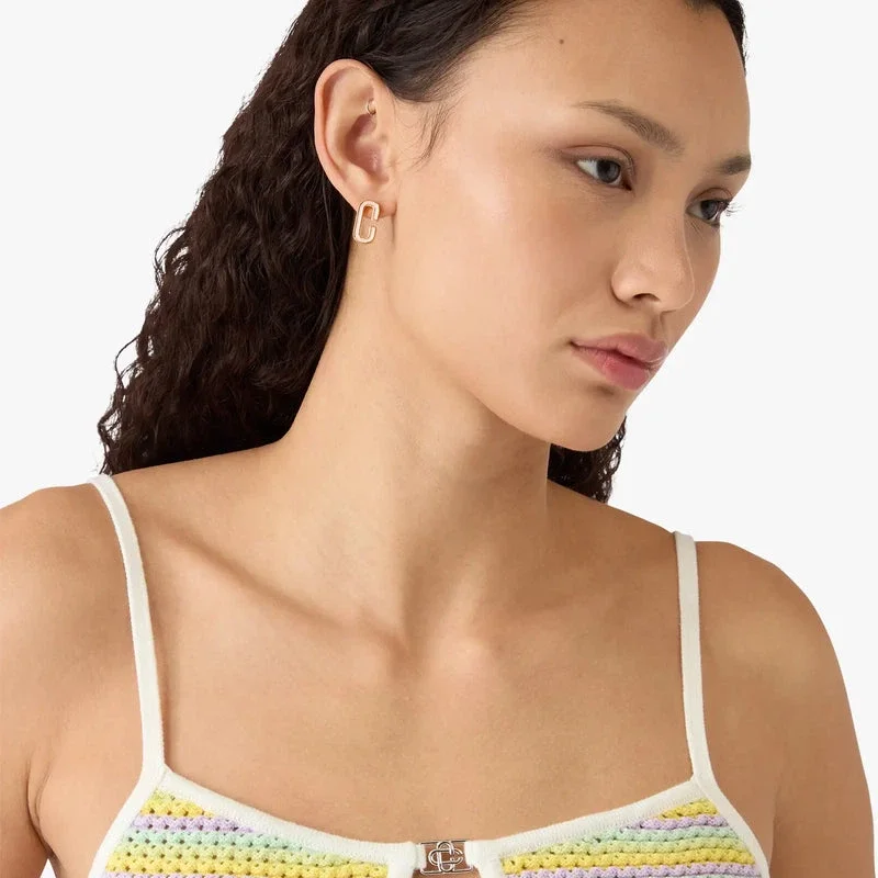 Bourgeois Striped Mini Dress er en raffinert strikket kjole med elegante horisontale striper. Den er utstyrt med kontrastfargede spaghettistropper, husets sølvbelagte Warped-logo på brystet og et nøkkelhullsdesign, med en flatterende silhuett som gjenspeiler husets sofistikerte tilnærming til strikkeplagg.
