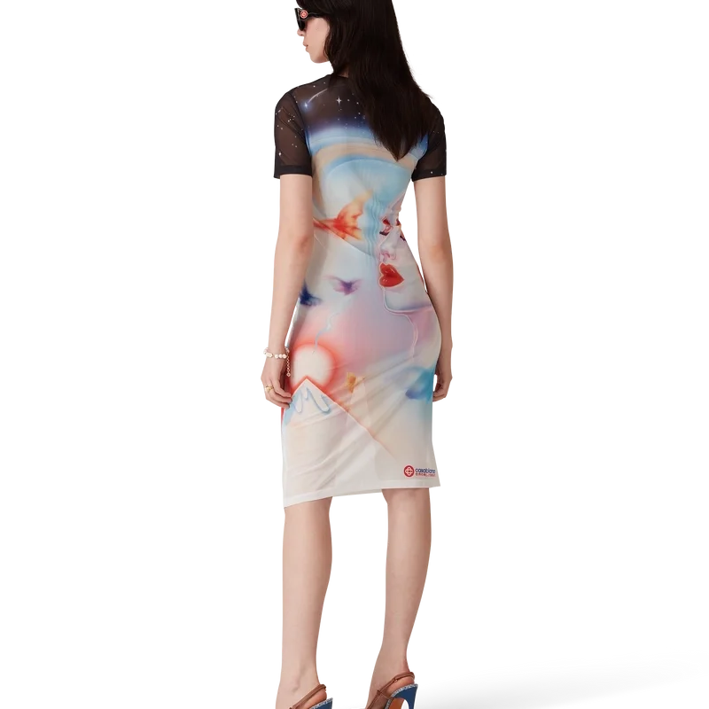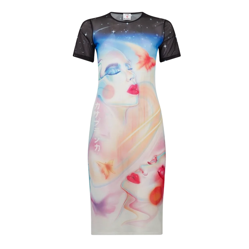 Galactic Connection Mesh-kjole med korte ermer er et trykt design laget av mesh-stoff med husets sesongbaserte airbrush-kunstverk – inspirert av Pater Sato; med Galactic Connection utforsker vi hvem de bioniske vesener i Casablanca ville være, samtidig som vi beholder fjellelementene i bakgrunnen. Fullført med en klassisk rund hals.