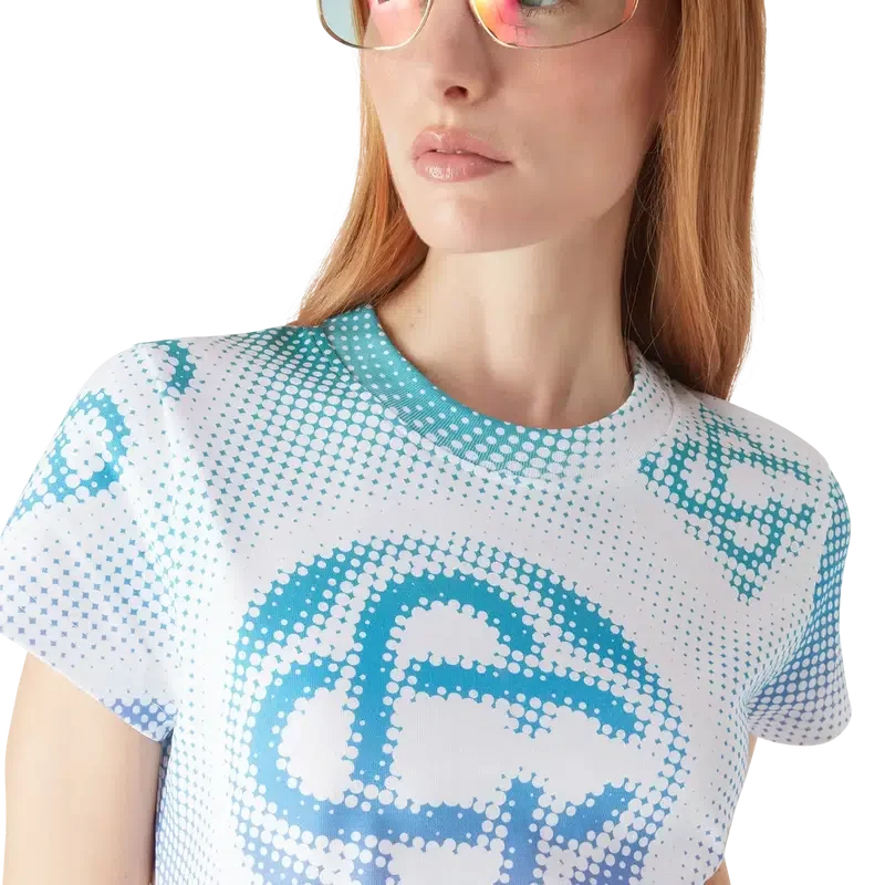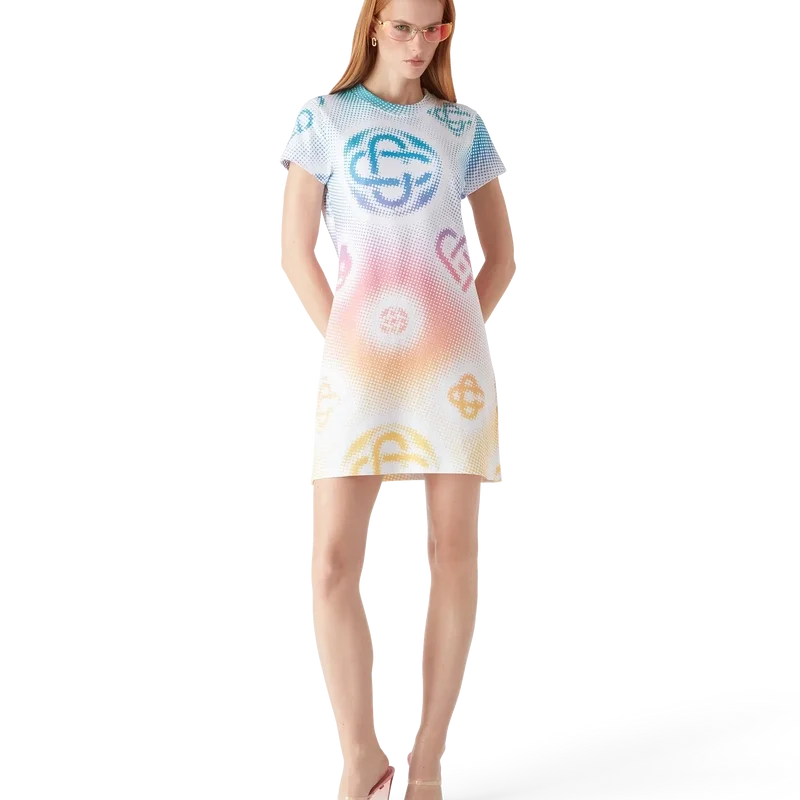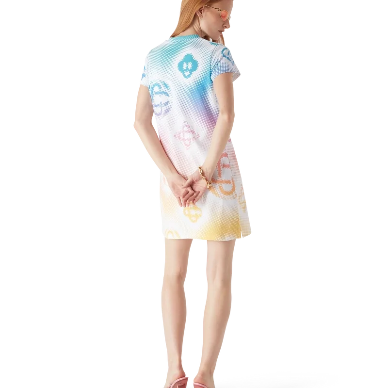 Halftone T-skjortekjolen er en kortærmet modell laget av trykt bomullsstoff med kunstverk av husets monogrammer laget med airbrush, basert på våre tidligere eksperimenter med teknikken, og fullført med en klassisk rund hals og avslappet silhuett.