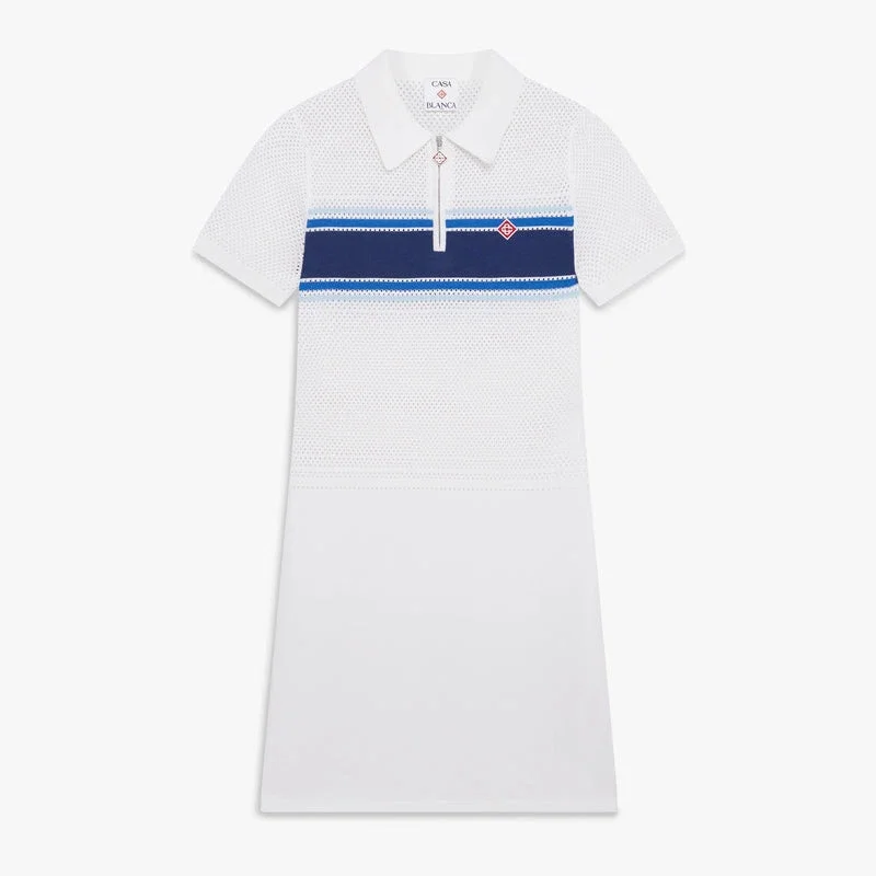 Den hvit- og blåstripete midikjolen i mesh er et raffinert strikket design med en blå stripe over brystet og på ryggen, med en elegant jacquardkonstruksjon med meshstriper. Fullført med en klassisk krage, glidelåslukking, husets signaturdiamantlogo, korte ermer med ribbede mansjetter og en avslappet midisilhuett.