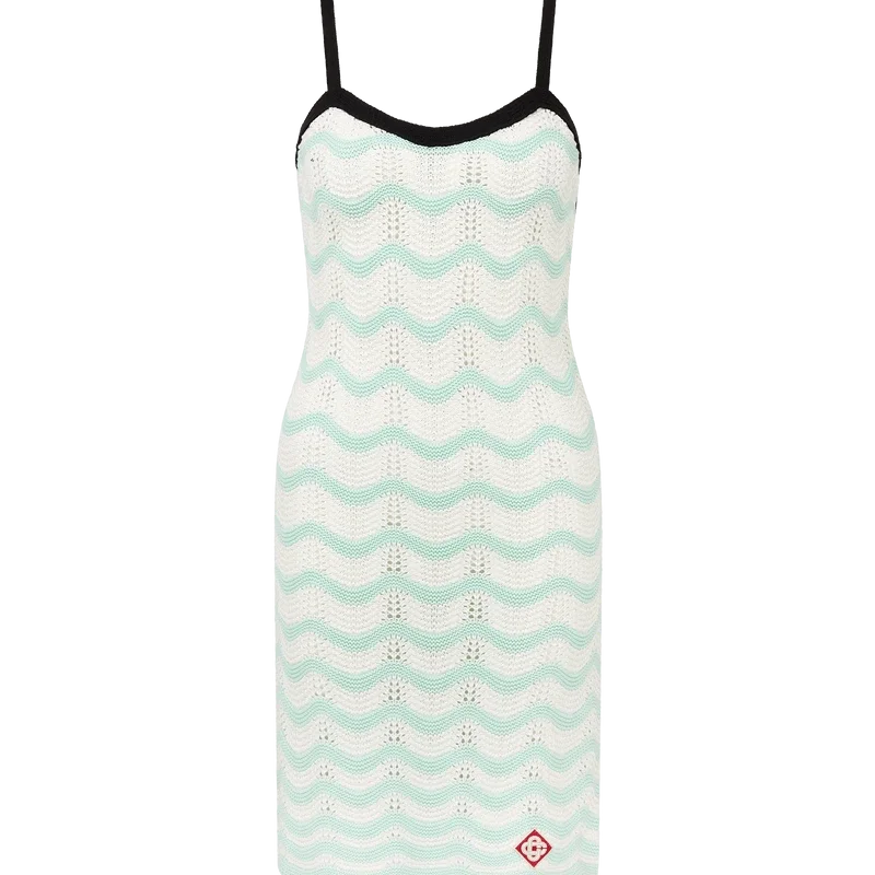 Wave Crochet Mini Dress er en ermeløs kjole med husets karakteristiske diamantlogo, laget av heklet bomullsstoff. Fullført med lav rygg, en Memphis-bølgeinspirert hemline, svart kontrastkant og spaghettistropper som festes på baksiden.