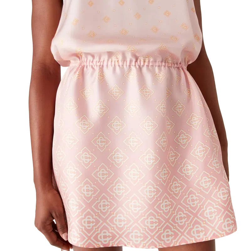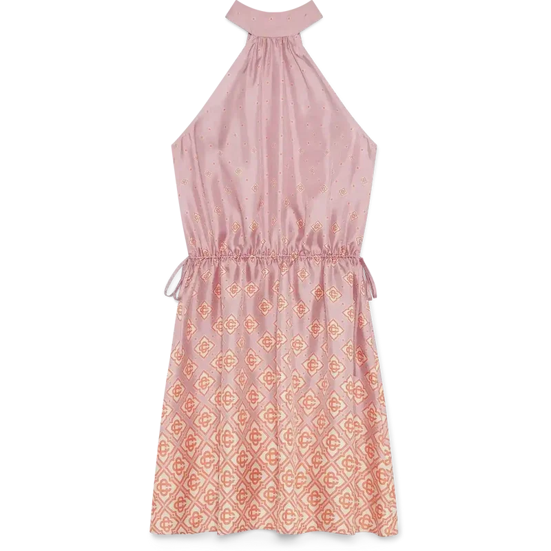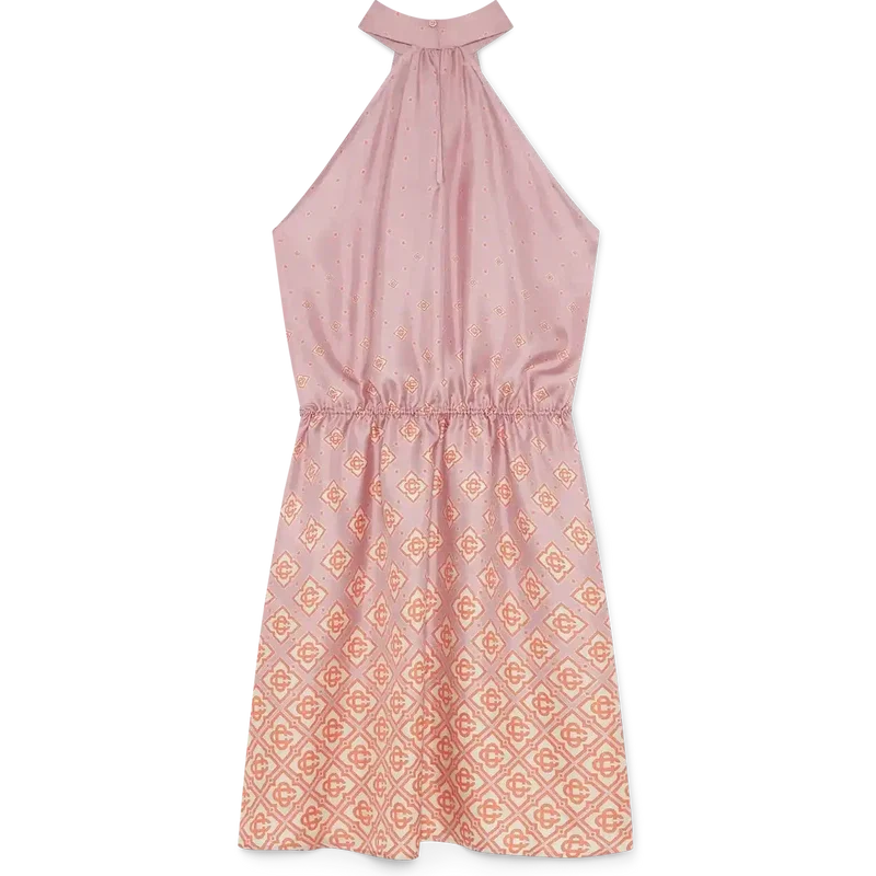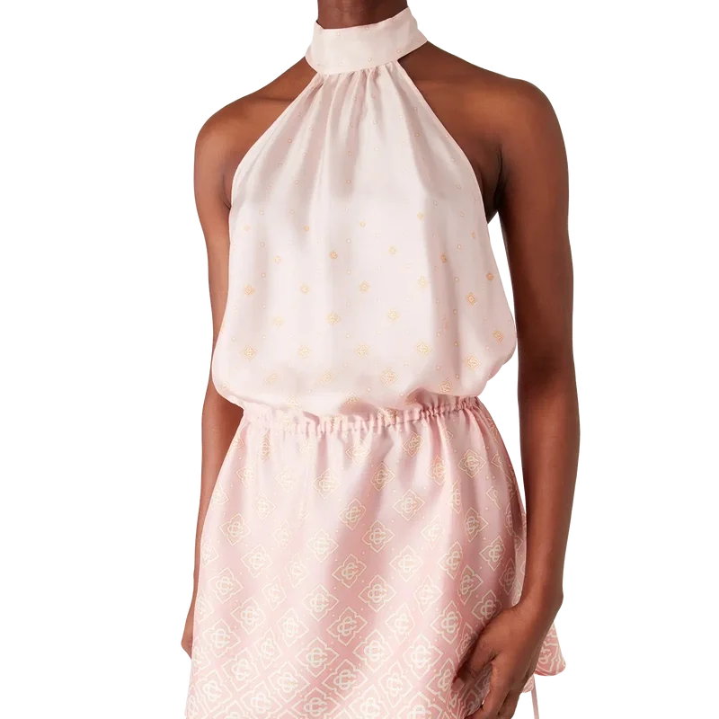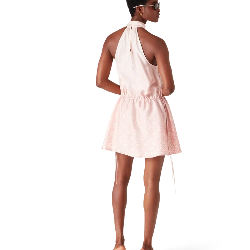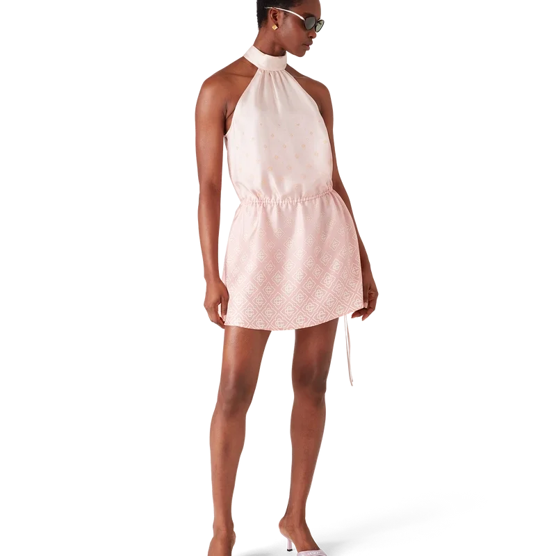 Monogram Degrade Silk Dress er en ermeløs minikjole med husets ikoniske monogram i gradientfarger. Fullført med halterneck, usynlig glidelås, løst rynket, senket midje og snørebånd i sidene.