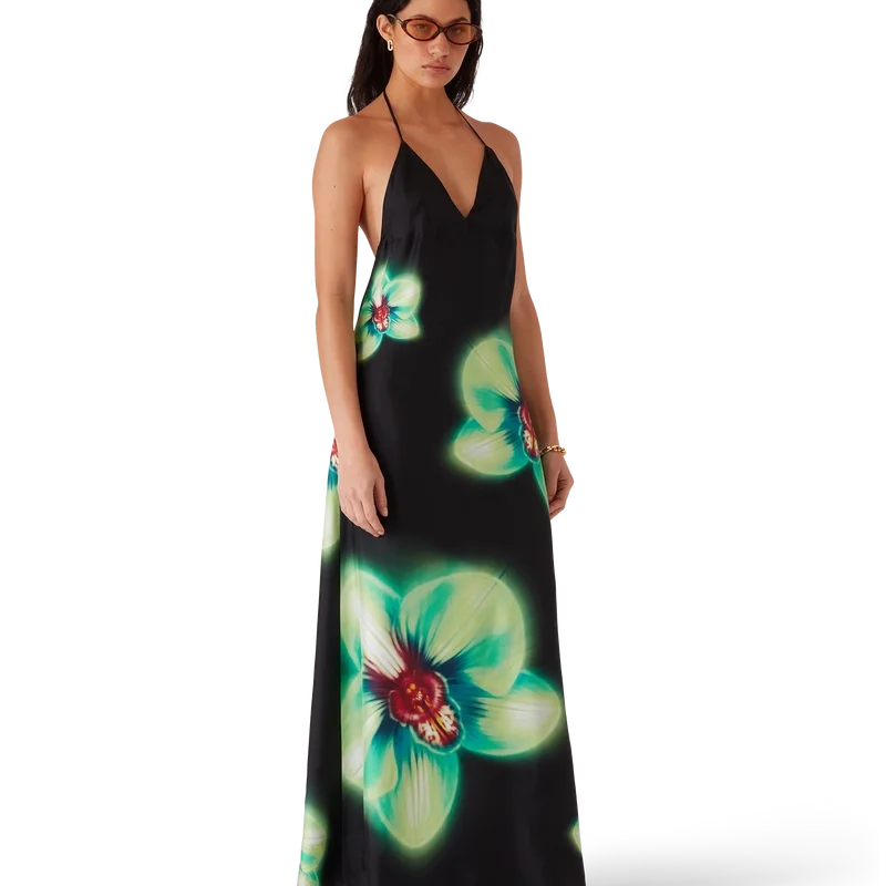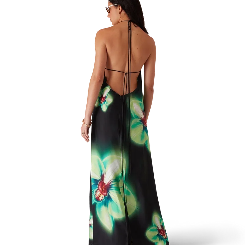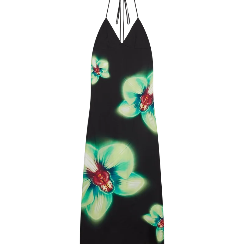 Orchid Glitch Silk Kjole er en maxi-kjole med halterneck som har sesongens blomst – orkideen – gjengitt ved hjelp av airbrush-teknikk. Det endelige designet kombinerer grafisk, sporty estetikk med Chrome-merkevareprofilering. Fullført med snørebånd i nakken og på ryggen, og en ryggløs A-linje-silhuett.