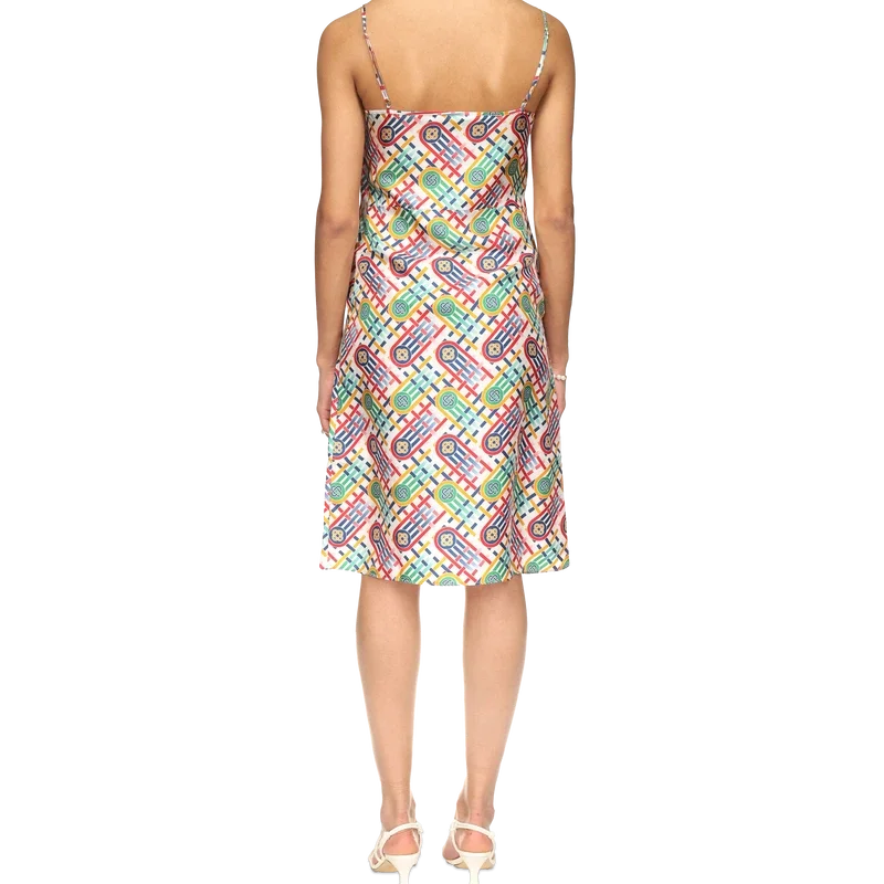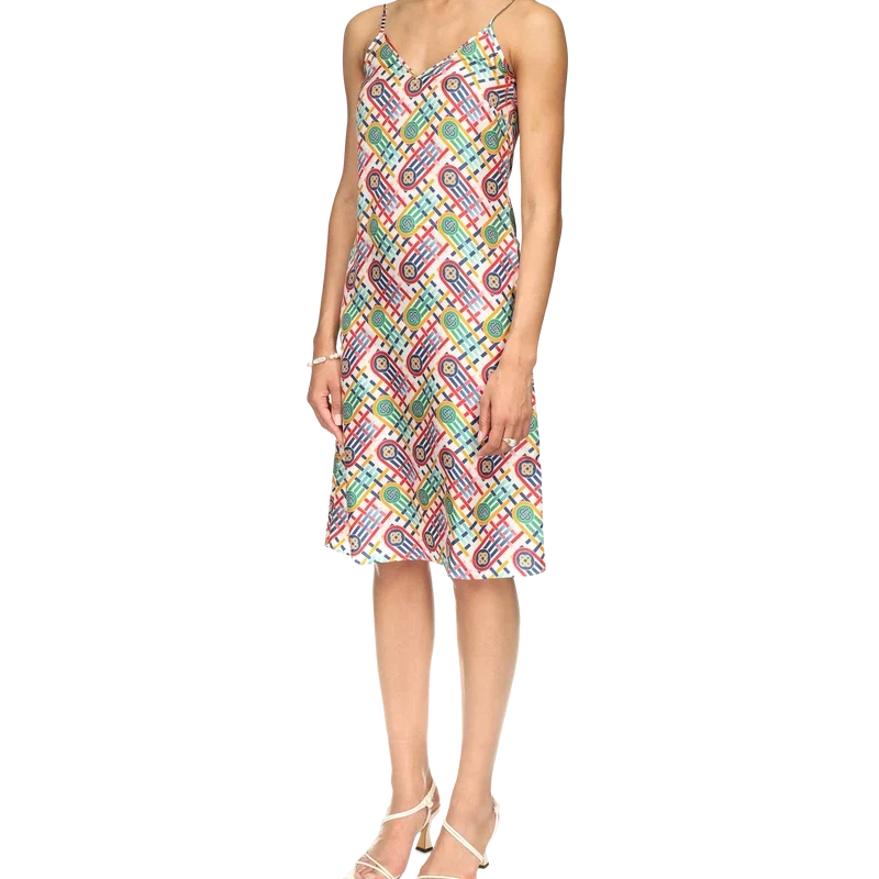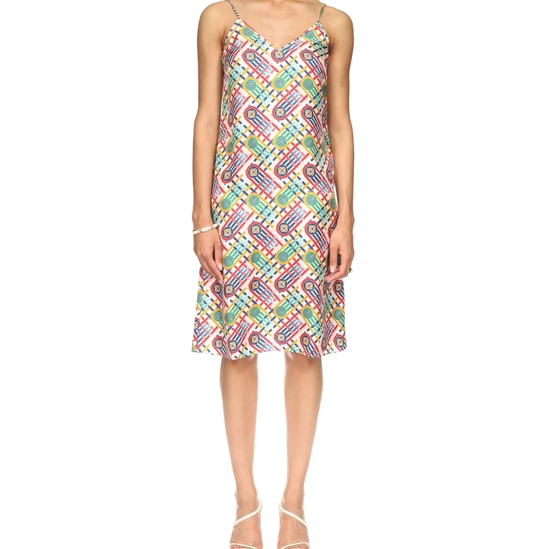 Ferdig med spaghettistropper og en mild V-hals, og skjerfet er lett utvidet i midten av skjørtet.