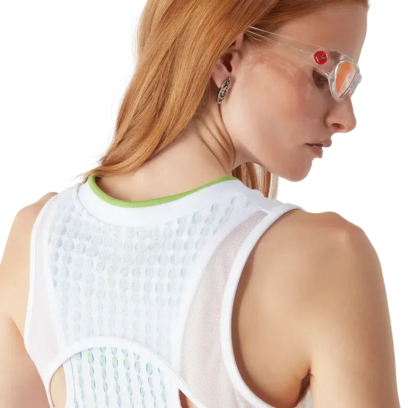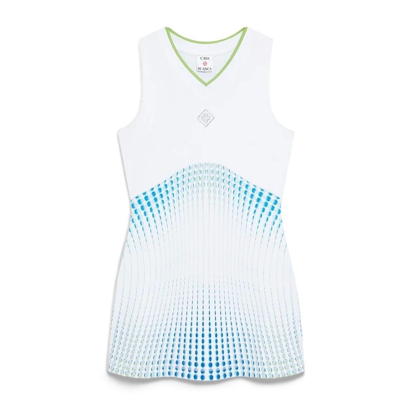 Racer-kjolen er et ermeløst design med trykk, med husets sølvfargede diamantlogo i midten, og kunstverk skapt i samarbeid med Martin Naumann, kjent for sitt arbeid med fargeoverganger og tekstureffekter. Fullført med en kontrastfarget, lav V-hals, et hvitt brystpanel og et trykt liv.