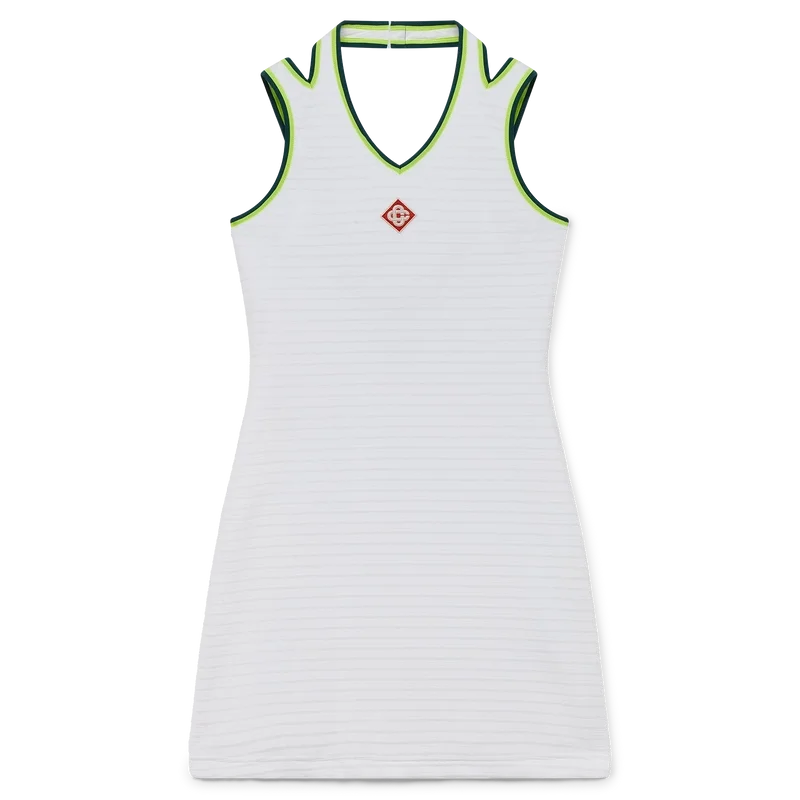 Den strukturerte velour-tenniskjolen er en A-linje-minikjole laget av velourstoff. Den har V-formet halterneck, skulderstropper med dyp utskjæring i ryggen og husets karakteristiske diamantlogo på brystet.
