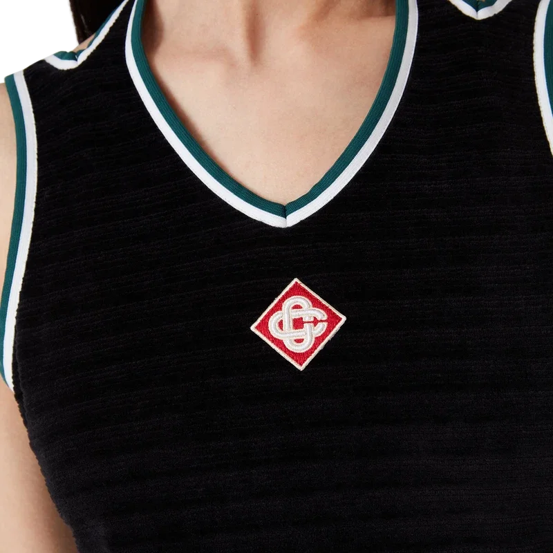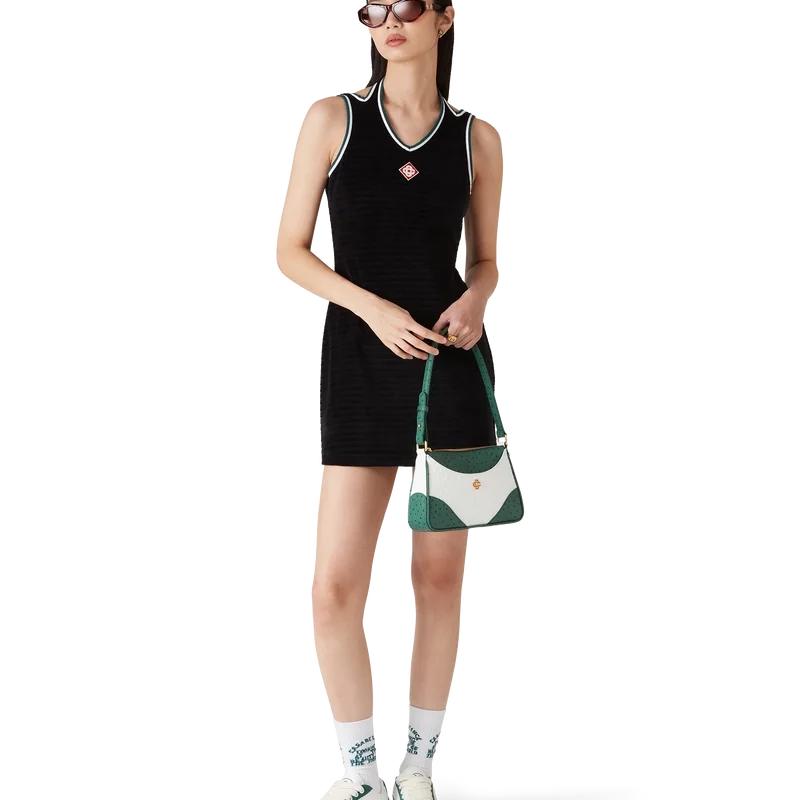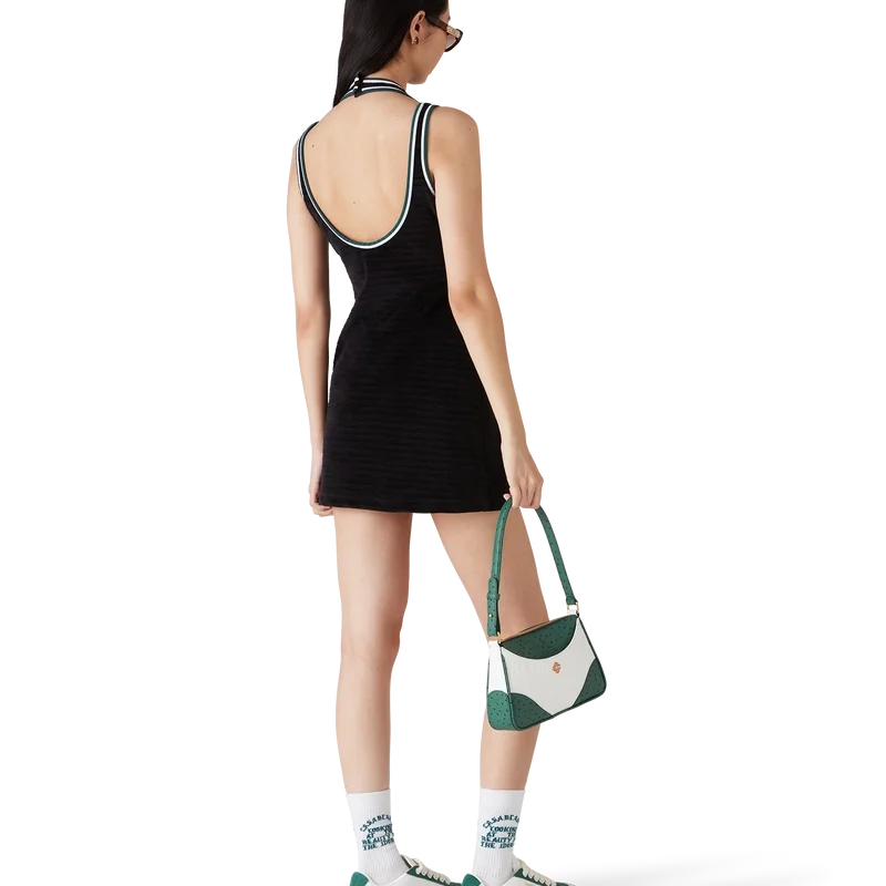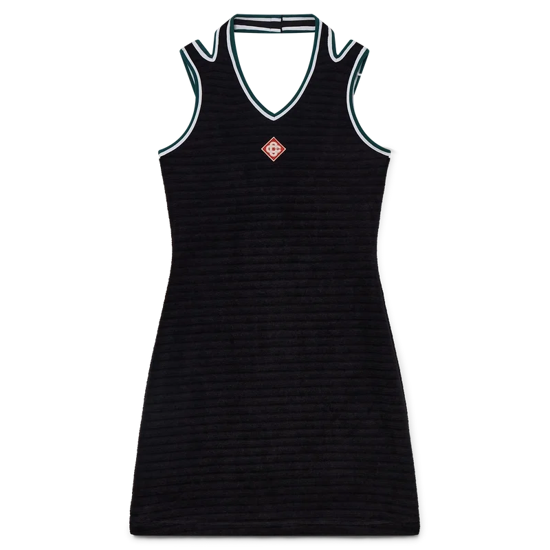 Den strukturerte velour-tenniskjolen er en A-linje-minikjole laget av velourstoff. Fullført med V-formet halterneck, skulderstropper med dyp utskjæring i ryggen og husets signaturdiamantlogo på brystet.