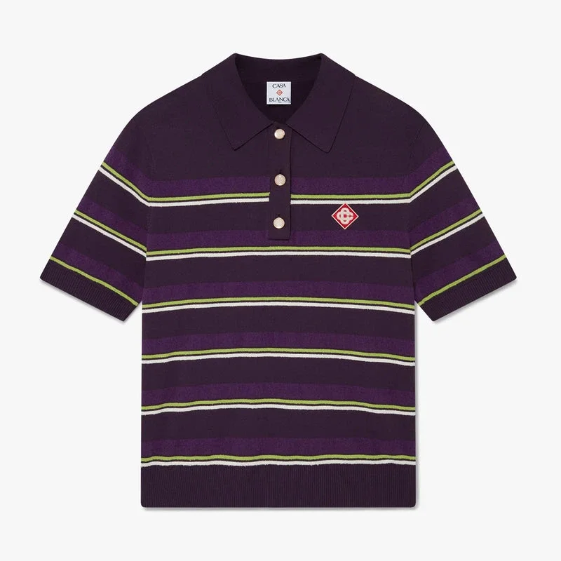 Den lilla og grønnstripete, tettsittende pique-skjorten har et raffinert strikket design med husets karakteristiske diamantlogo. Den har knappelukking, karakteristiske gullkantede perleknapper, ribbede mansjetter, nederkant, krage og knappelukking, en slank silhuett og stripete detaljer som gjenspeiler husets fritidskoder.