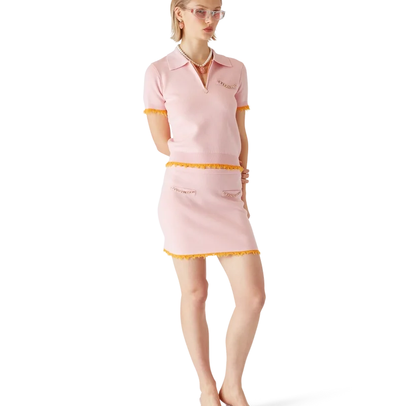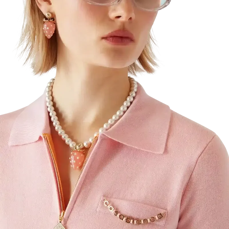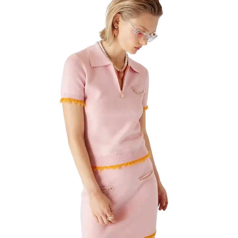 Pique-skjorten er en kortærmet modell laget av merinoullstoff med en klassisk silhuett og lommer. Den har ribbestrikket krage, glidelås med husets karakteristiske diamantlogo på glidelåstappen, brystlomme med kant, ribbestrikkede mansjetter og nederkant med frynsede kanter, samt en avslappet passform med raffinert konstruksjon.