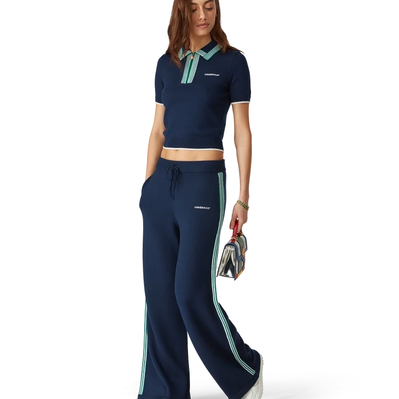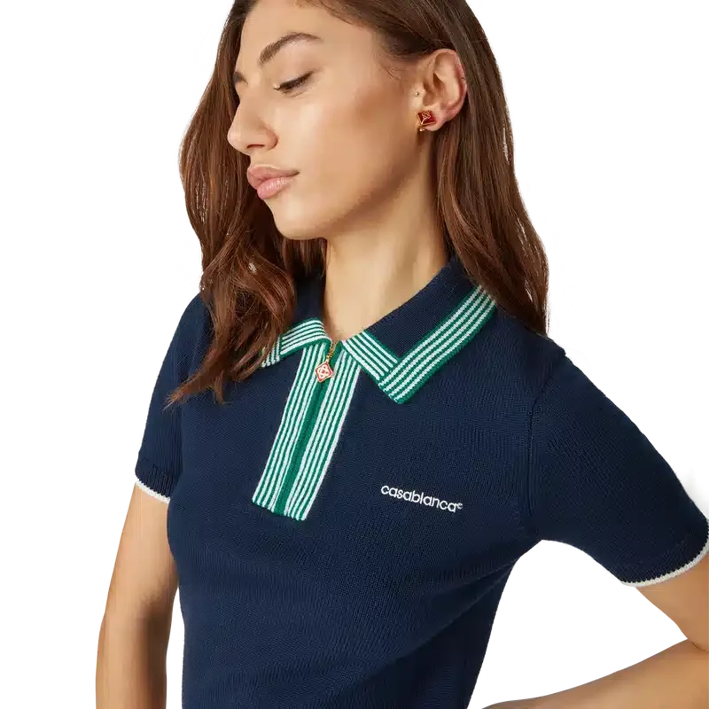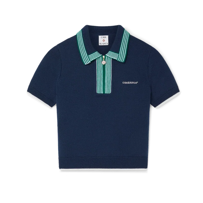 Den strikkede tennis-pique-skjorten har et klassisk design og er laget av merinoullstoff. Den har kontrastfargede ribbede kanter på mansjetter, nederkant, krage og knappelukking, glidelås foran, ribbkrage og Casablanca-logo.