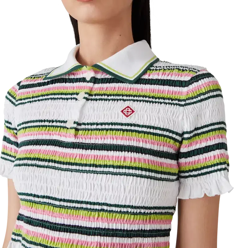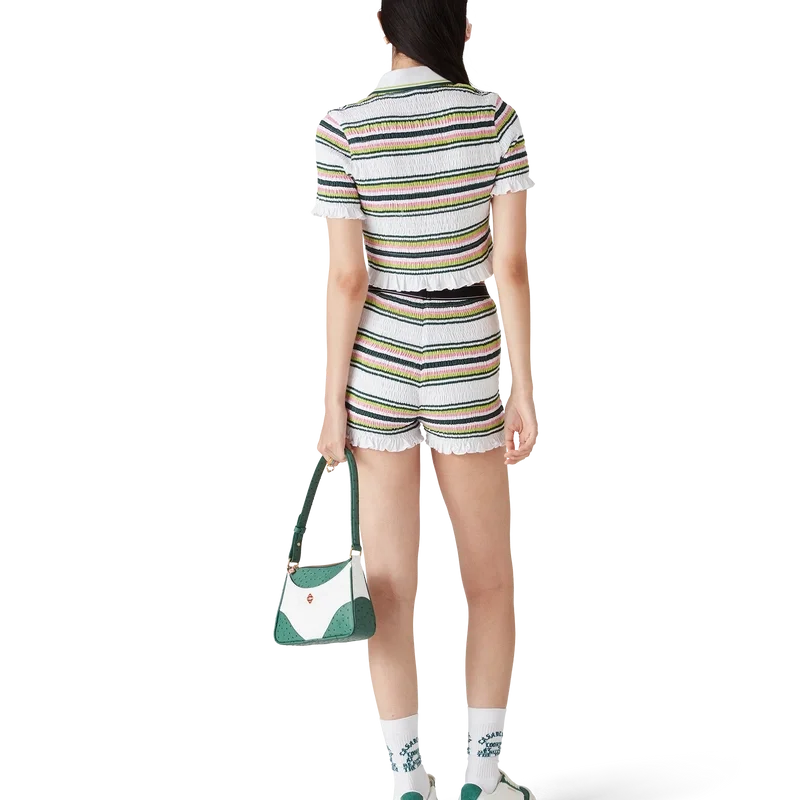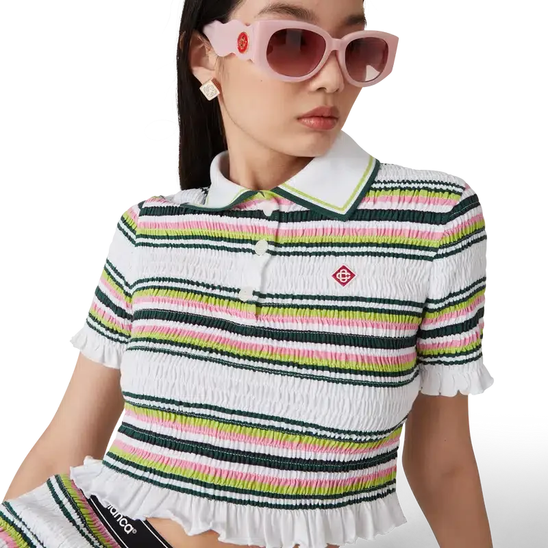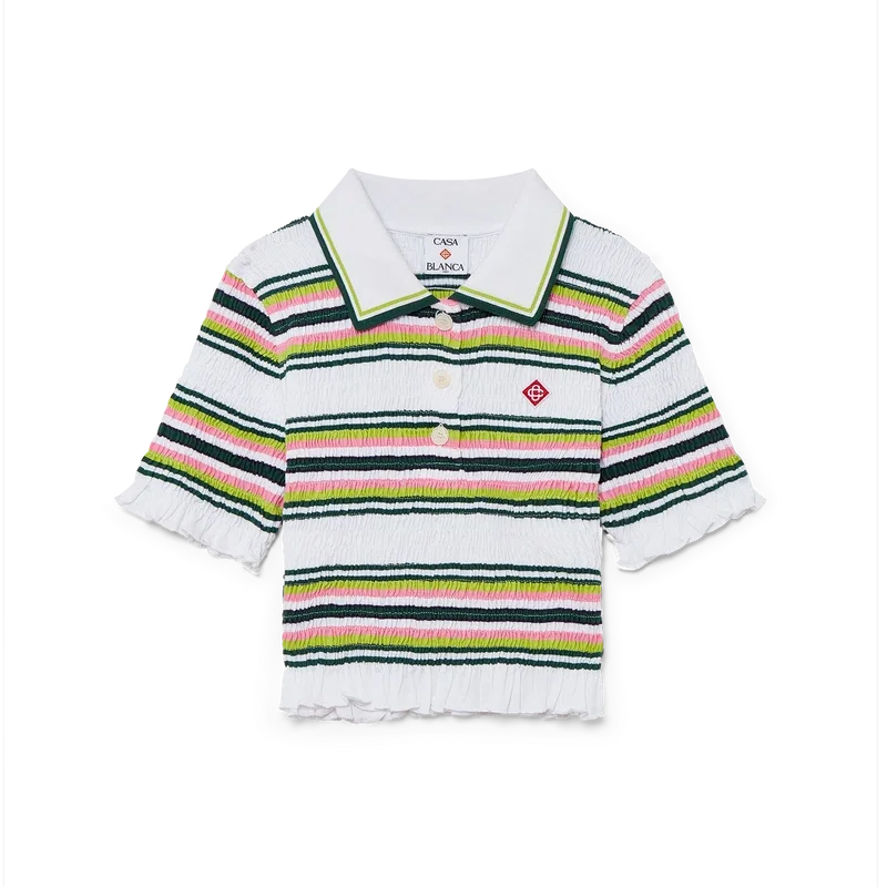 Den stripete, korte poloskjorten er en kort modell med husets karakteristiske diamantlogo. Laget av rynket bomullsstoff og fullført med ribbkrage med stripete kantdetaljer, knappestolpe med tre knapper, korte ermer og volangdetaljer på mansjetter og nederkant. Designet for å sitte over navlen.
