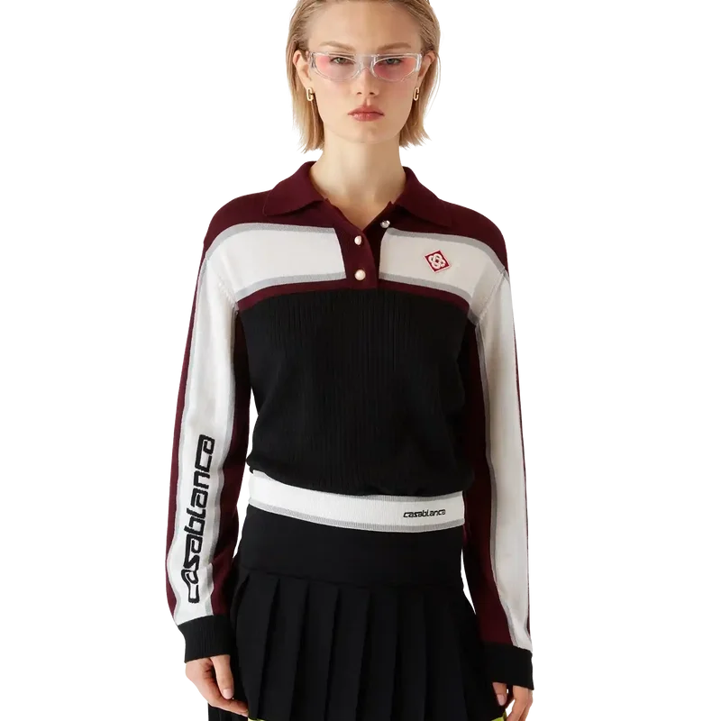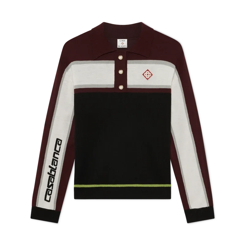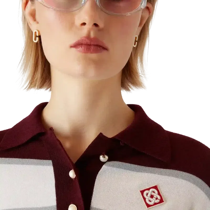 Den stripete oversized langermete poloskjorten er et avslappet Apras-Sport-design med husets diamantlogo. Fullført med Casablanca-logoen nedover den ene ermet, et ribbet kroppspanel, knappelukking med signaturperleknapper med gullkant, ribbet krage, mansjetter og detaljer i nederkant.