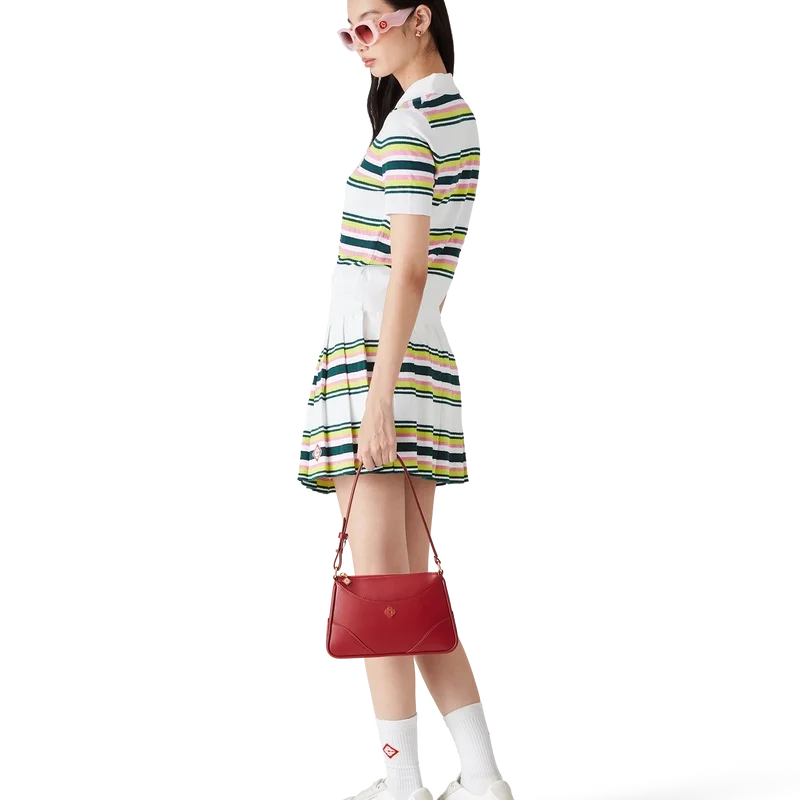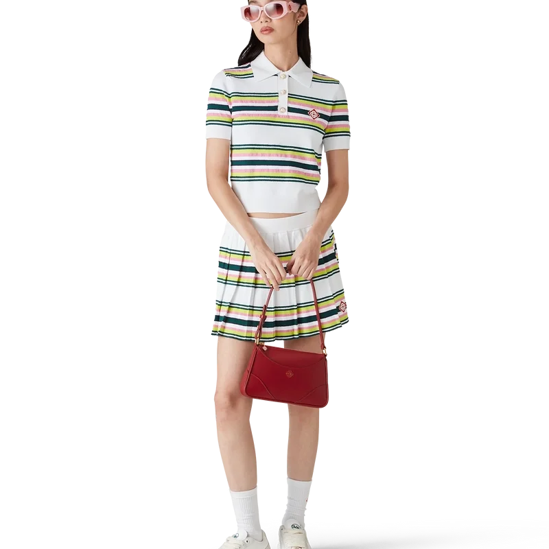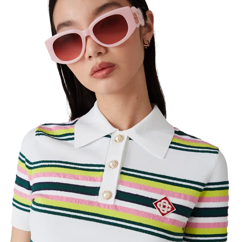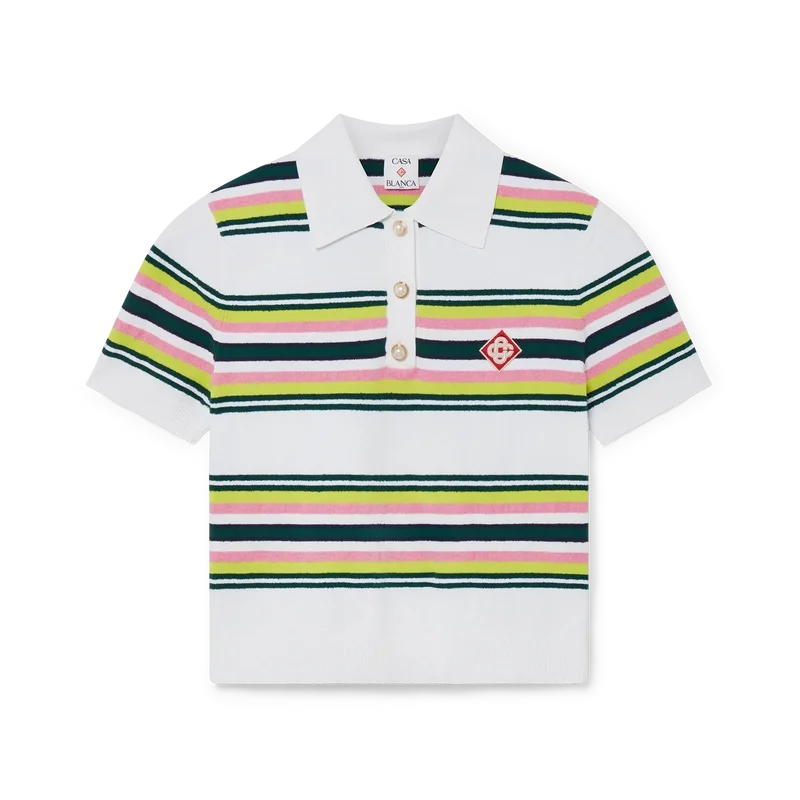 Den stripete pique-skjorten er en kortærmet modell laget av stripet strikket stoff med husets karakteristiske diamantlogo. Fullført med karakteristiske gullkantede perleknapper, treknappslukking og ribbede mansjetter, nederkant, krage og knappelukking.