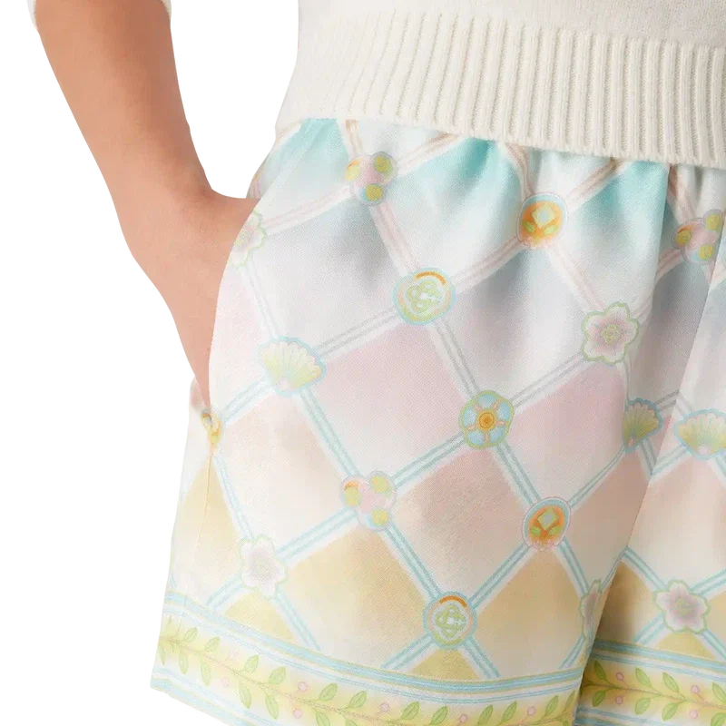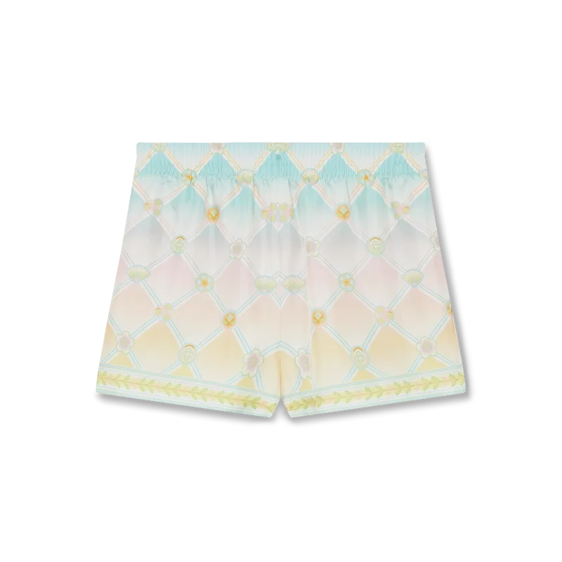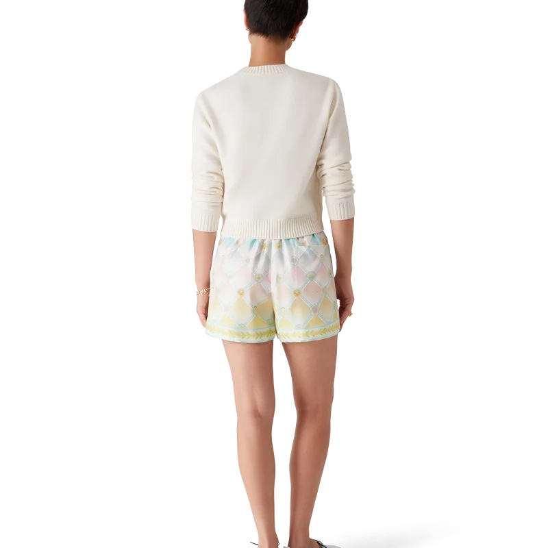 Candy Icons Silk Twill Shorts er en shorts med heltrykt design laget av silke med Candy Icons-mønsteret, som er skapt med pastellfarger og våre kawaii-ikoner i tankene. Det er et repeterende mønster som også inneholder en gradient-effekt. Dette mønsteret finnes i både herre- og damekolleksjonene. Komplett med elastisk linning, snøring, lommer i sømmen, en påsydd lomme bak og detaljer i kanten med husets laurbærblad-motiv.