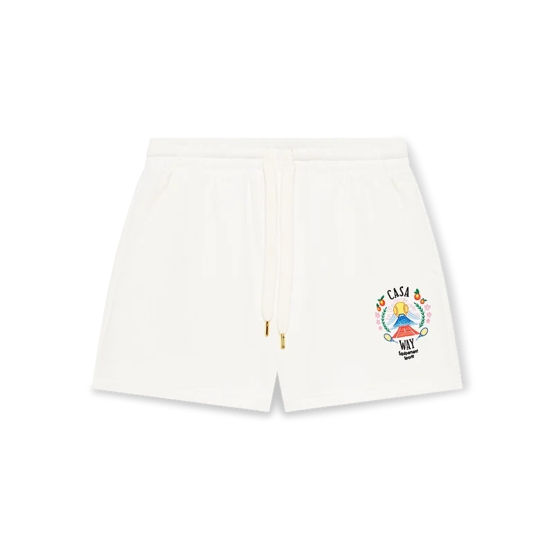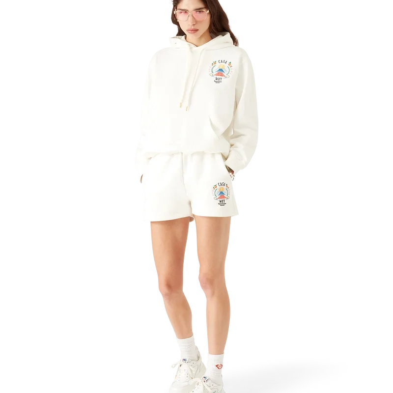 Casa Way Mountain Sweatshorts er et sportsklærdesign laget av økologisk bomullsstoff med husets sesongbaserte kunstverk, nyfortolket for denne sesongen. Utstyrt med elastisk linning med snøring med gullspisser, lommer i sømmen og en påsydd lomme bak.
