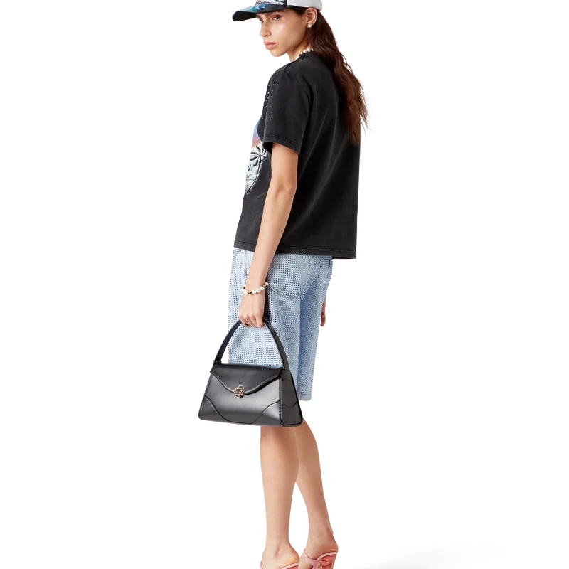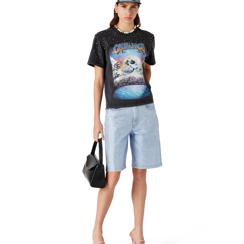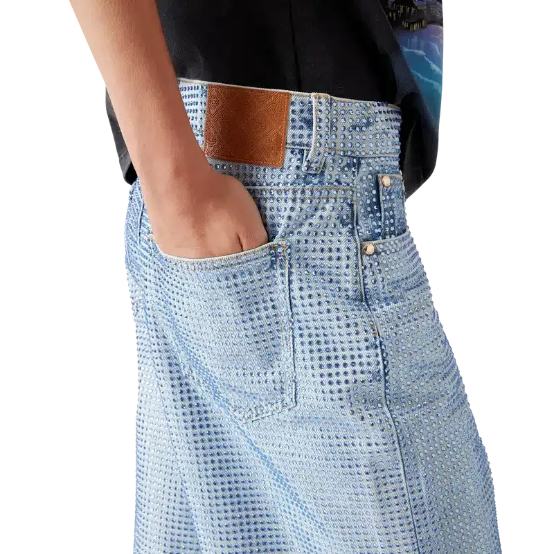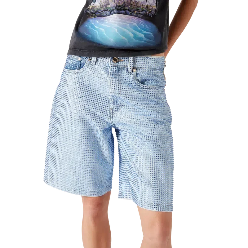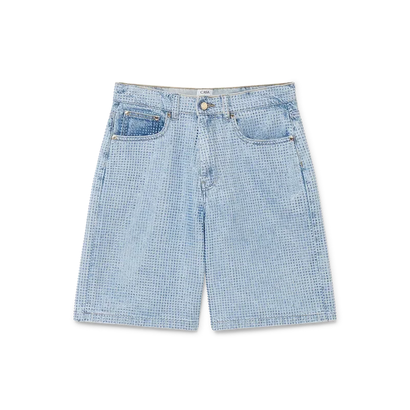 De krystallpyntede denimshortsen har et knelangt design med en avslappet silhuett, laget av denimstoff og glassperler. Utstyrt med fôr, lommer foran og bak, glidelåslukking og beltestropper.