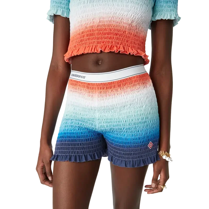 Gradient Shirred Shorts er shorts med heltrykk som har husets karakteristiske diamantlogo. Utstyrt med elastisk linning med Casablanca-logo og kantdetaljer, samt volangdetaljer i nederkant.