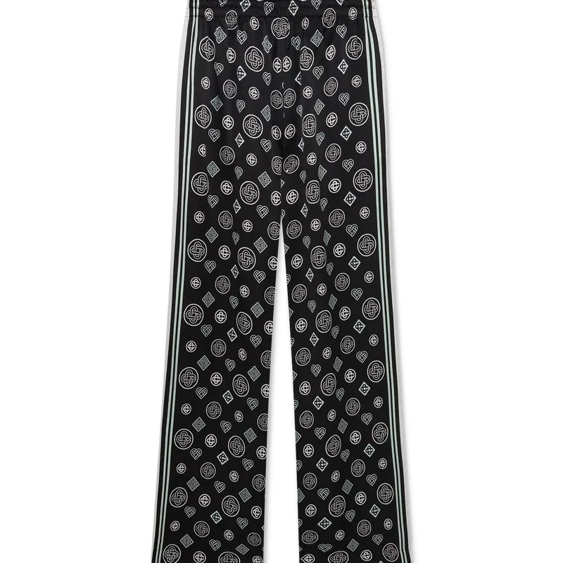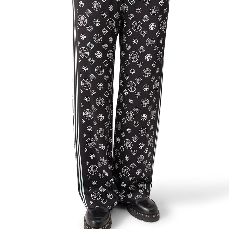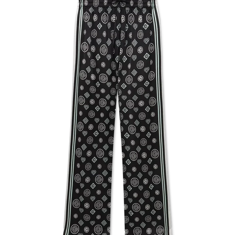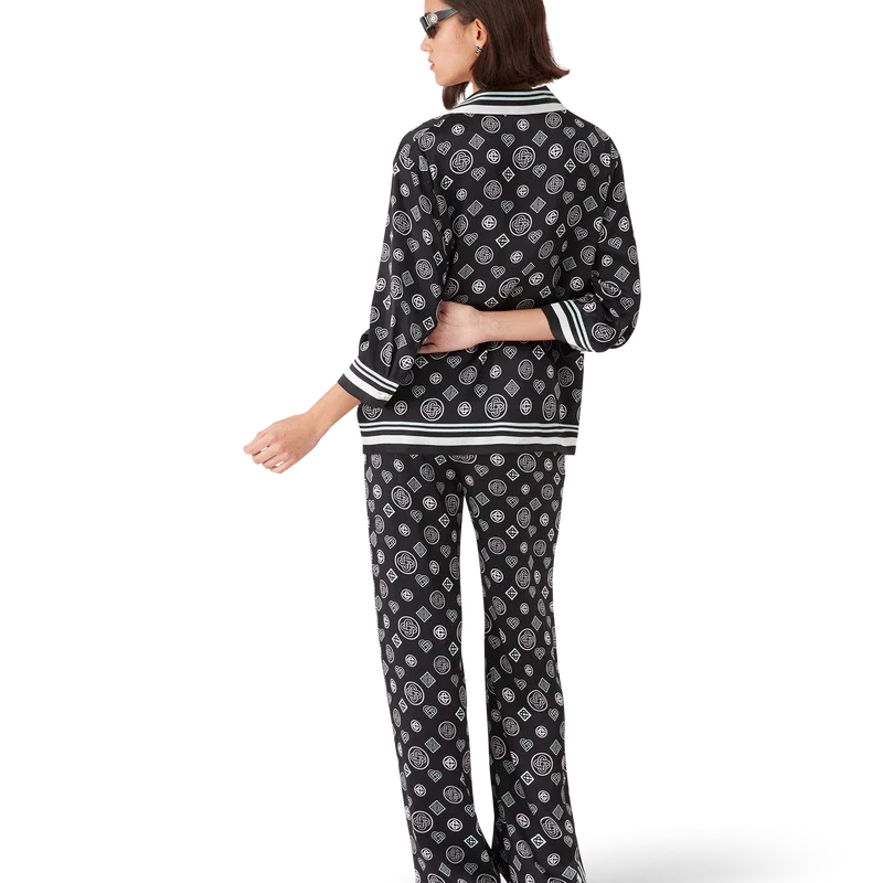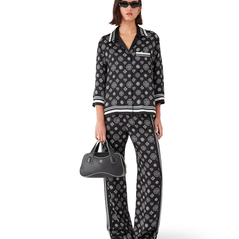 Monogram-pyjamasbuksene i silkesatin har et heltrykt design med sesongens Honeydew-logotrykk. Dette mønsteret skiller seg fra våre andre monogrammer, da det kombinerer unike former for å danne et helhetlig mønster. Det er mer et ikonbasert design. Komplett med elastisk linning, snøring, sidelommer i sømmen og detaljer i svart og hvite striper nedover sidene.