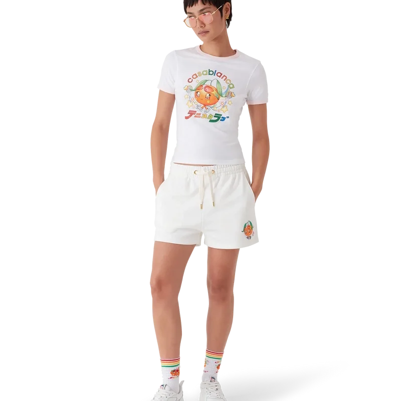Tennis Mascot-sweatshortsene med vattert mønster har et brodert design, laget av et vattert stoff med rutemønster og sesongens kunstverk av den kawaii tennisballen – denne figuren er en sentral del av vårt univers. Den inneholder elementer som laurbærbladet, Atlantis-sneakeren, racketen og de kawaii øynene. Vi har valgt å bruke denne figuren som det sentrale motivet på alle herremodellene i kolleksjonen. Utstyrt med elastisk linning, snøring, lommer i sømmen og en påsydd lomme bak.