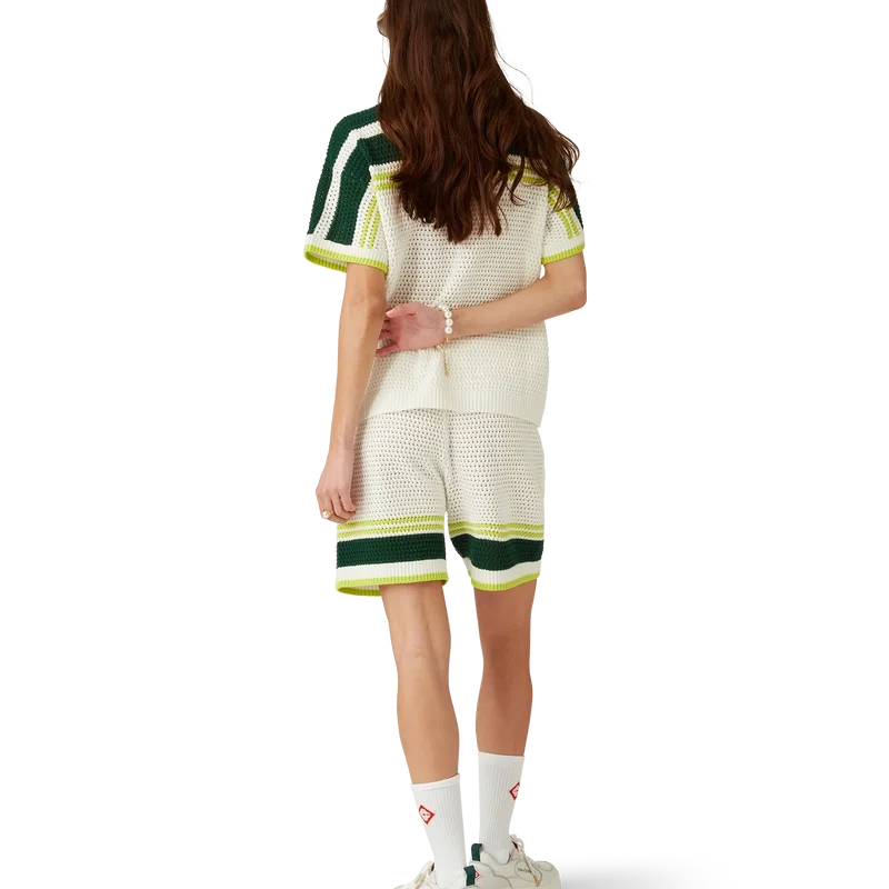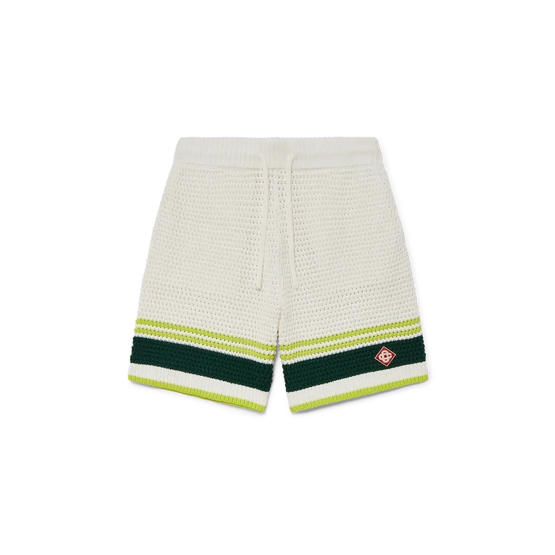 Tennis Crochet Shorts er et design med myk tekstur laget av strikket bomullsstoff, med husets karakteristiske diamantlogo. Avsluttet med en ribbet elastisk linning med snøring, sidelommer og kontraststriper på benene.