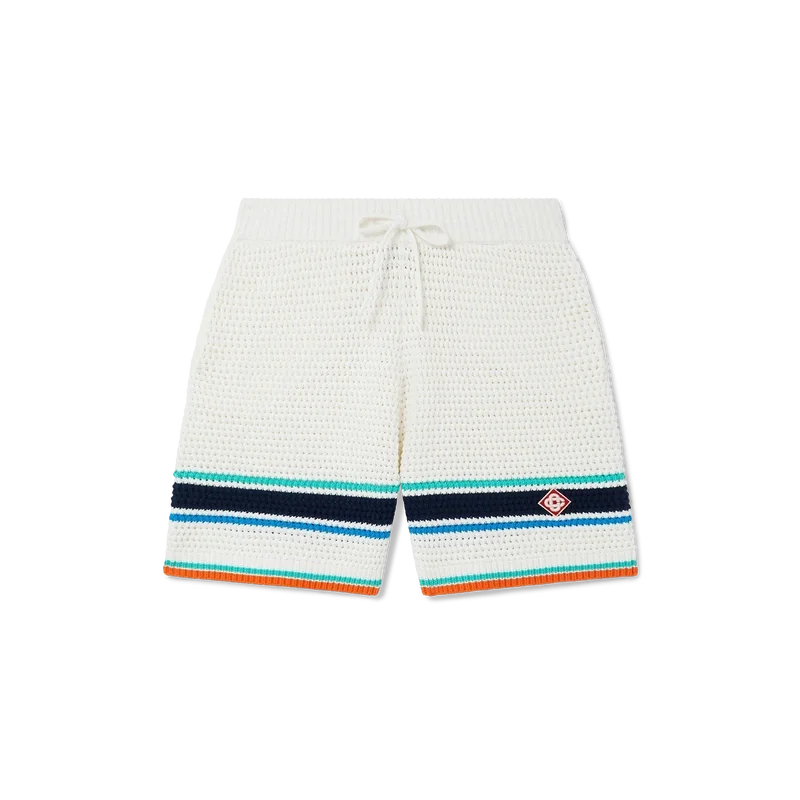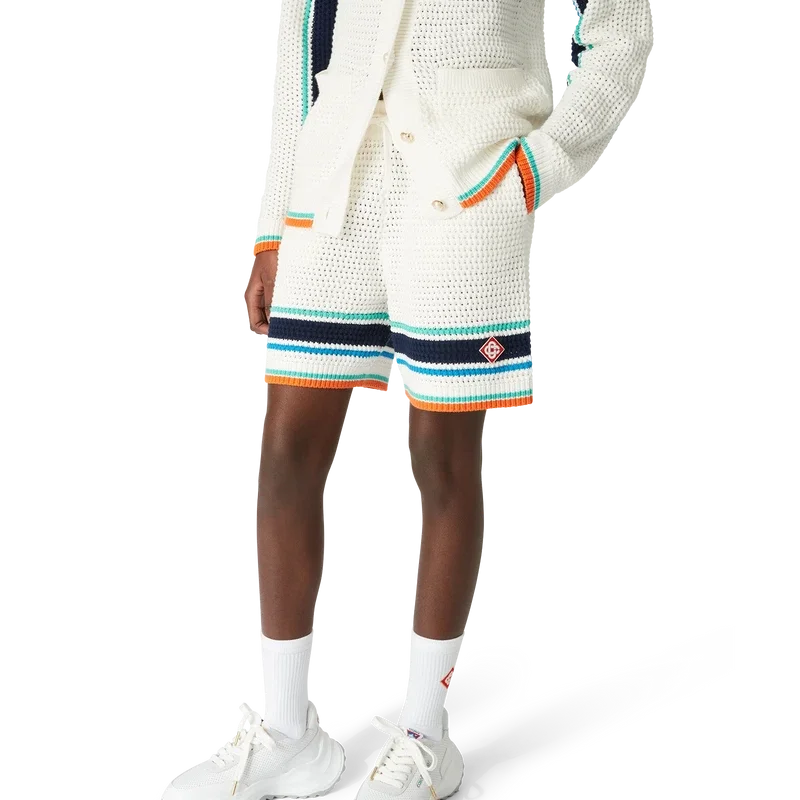 Tennis-hæklingsshortsen har et mykt strukturert design laget av strikket økologisk bomullsstoff, med husets karakteristiske diamantlogo som knytter seg til kapselsamlingens reise- og ferietema. Avsluttet med en ribbet elastisk linning med snøring, sidelommer, detaljer i aqua, blå og hvite striper og kontrastdetaljer i oransje på kanten.