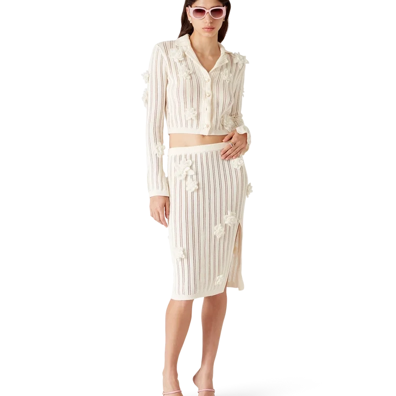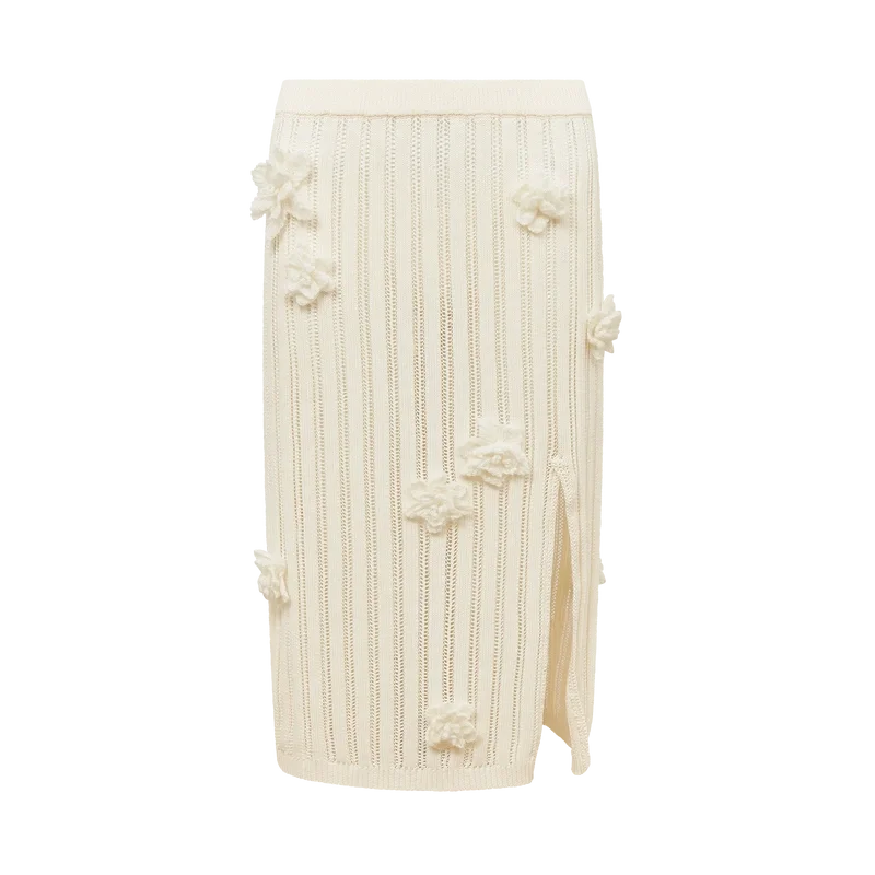 Blomsterblonderskjørtet er et knelangt design laget av et blonderstrikket bomullsstoff. Fullført med en elastisk ribbestrikket linning, en spalte og applikasjoner med blomstermotiv.