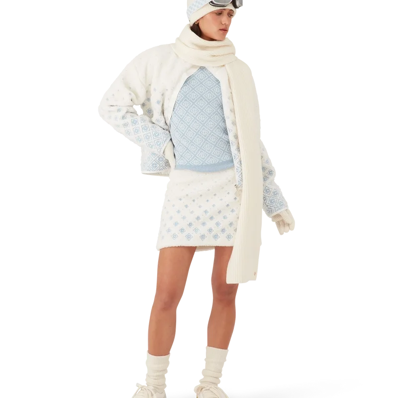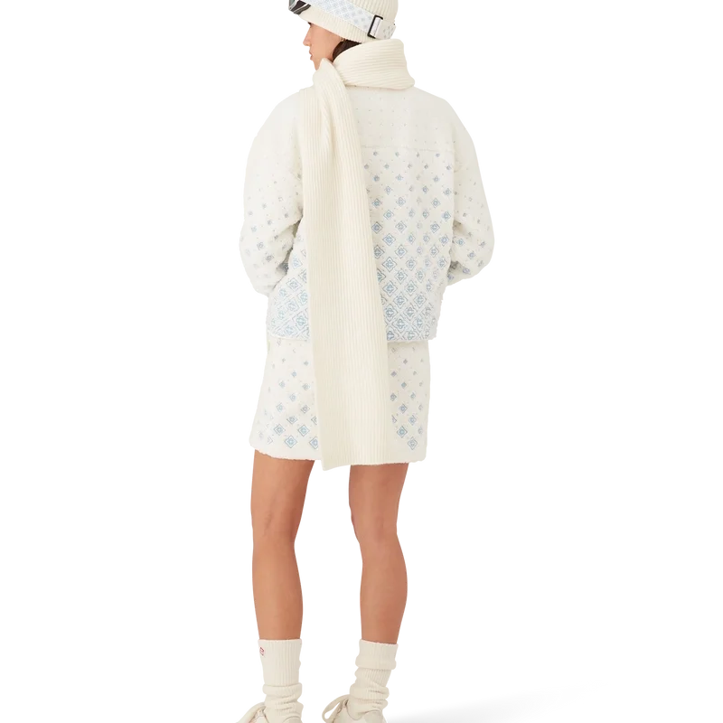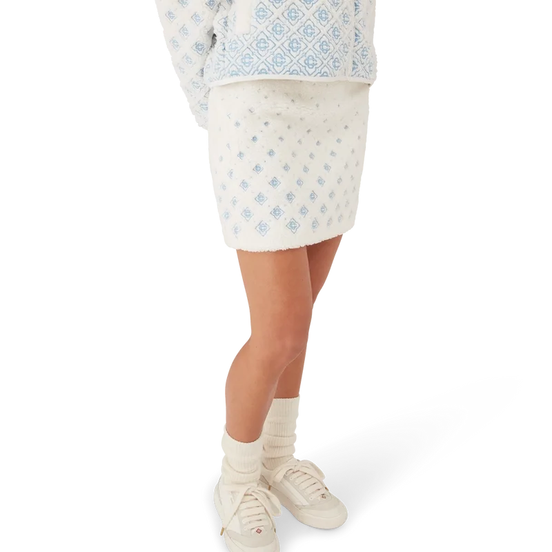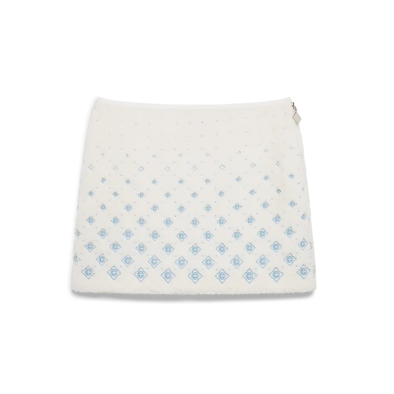 Den broderte miniskjørtet i fleece med monogram i fargeovergang er et raffinert design fra Apras-Sport, laget av teknisk fleecestoff i hvitt, inspirert av de elegante silhuettene i det japanske vinterlandskapet. Designet henter inspirasjon fra den elegante enkelheten i landsbylivet, der form og funksjon smelter sammen i et tidløst design, og snødekte landskap inspirerer til minimalistisk skjønnhet.