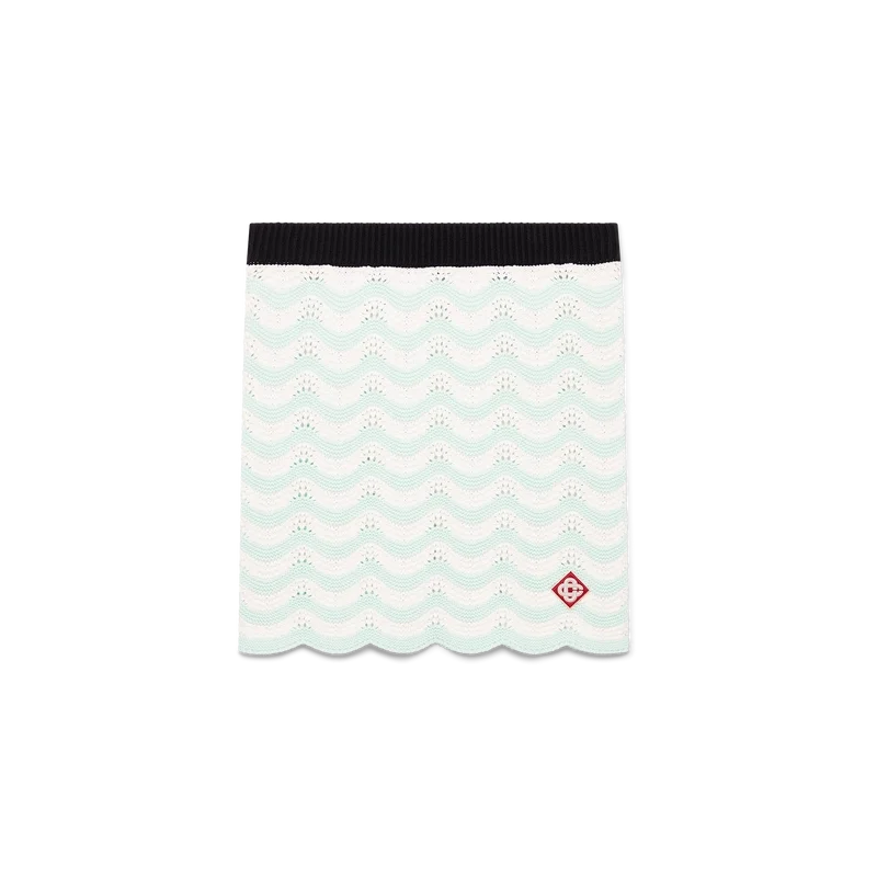Cotton Wave Crochet Mini Skjørt er en tettsittende miniskjørt med husets karakteristiske diamantlogo, laget av heklet bomullsstoff. Fullført med en svart, elastisk linning i kontrastfarge og bølgeinspirert kant.