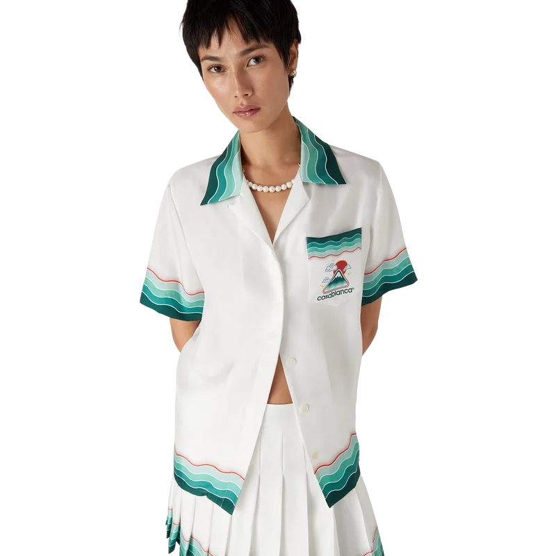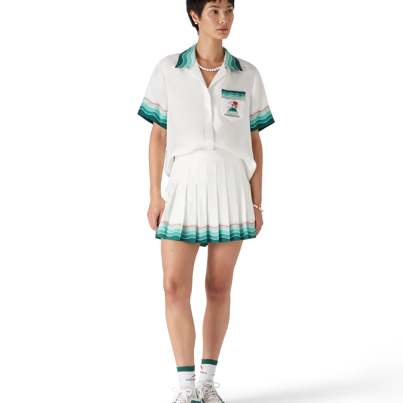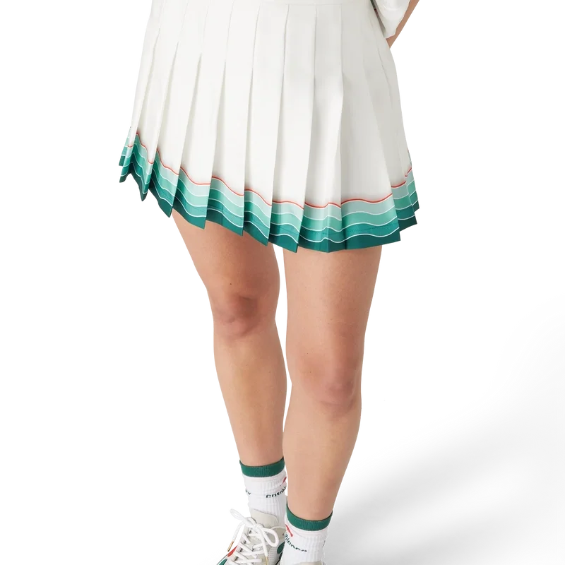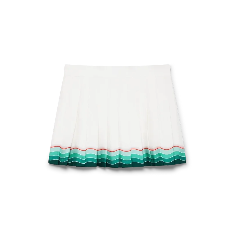 Tennis-plissert silke-miniskjørt er et klassisk design laget av silketwill-stoff. Utstyrt med linning, glidelåslukking, fôr og Memphis-bølgeinspirert gradientstripe-detalj i kanten.