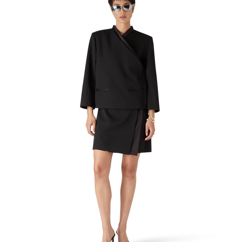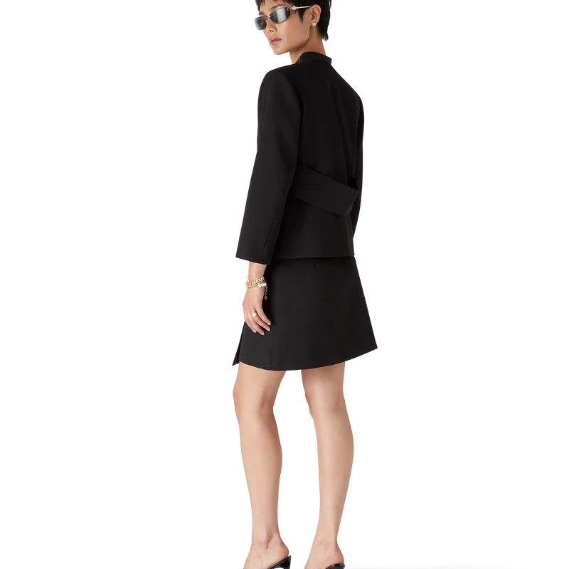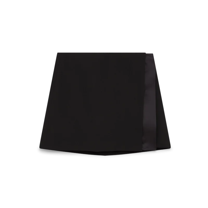 Skjørtet i skreddersydd ull er et kort skjørt laget av skreddersydd ullstoff. Det har en flat knapp med Cc-logo, en spalte fra kanten til midjen og en svart kontrastplissering langs spalten.