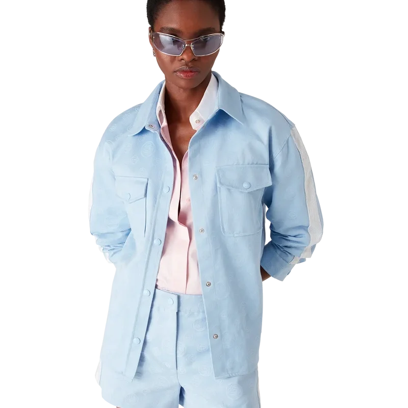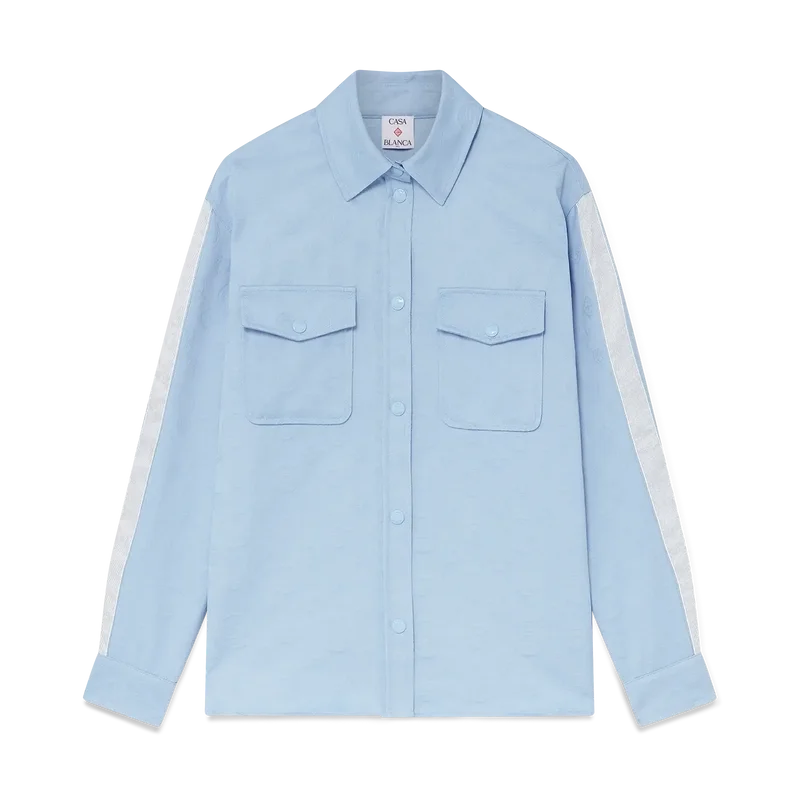 Den blå Monogram-skjorten med lange ermer er et klassisk design med husets ikoniske Monogram-trykk. Fullført med knappelukking, spiss krage, brystlommer og silkeinnsatser nedover ermene.