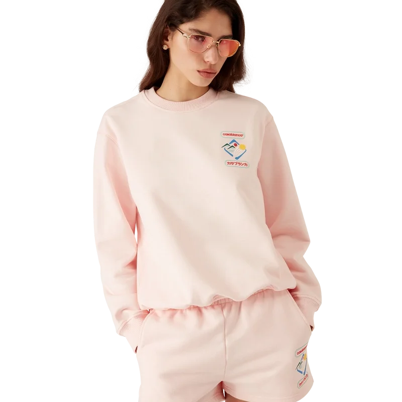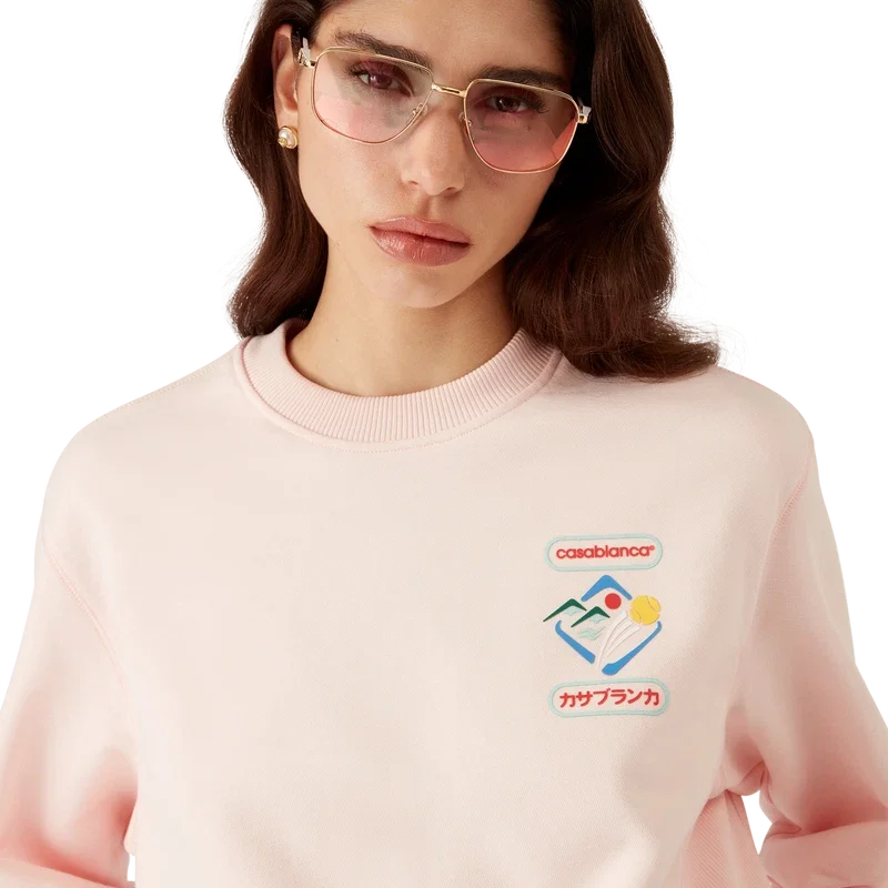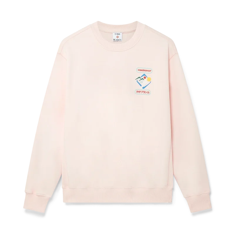 Casablanca Montagne Sportif-genseren er en langermet modell laget av økologisk bomullsstoff med husets sesongbaserte kunstverk. Fullført med klassisk rund hals, ribbede sidepaneler og ribbede mansjetter og nederkant.