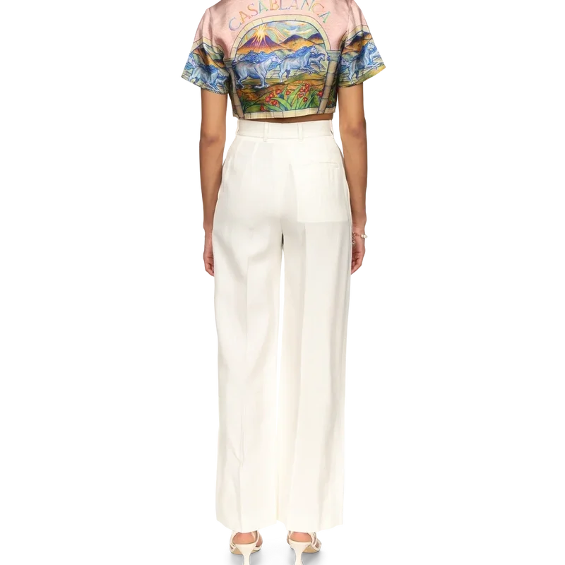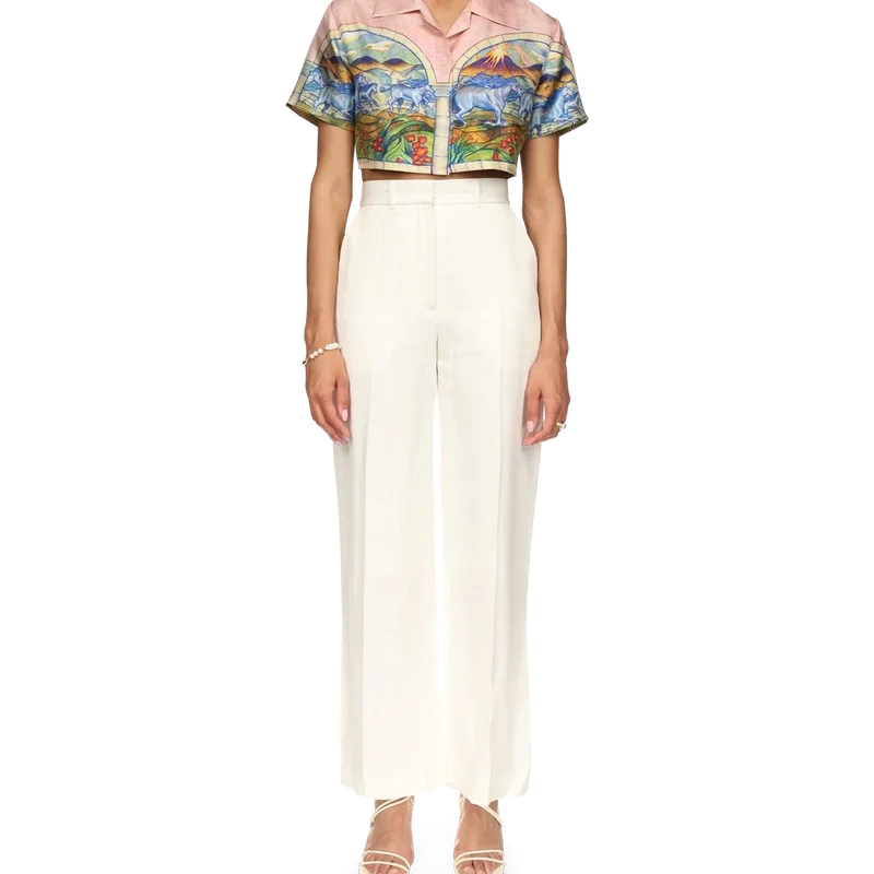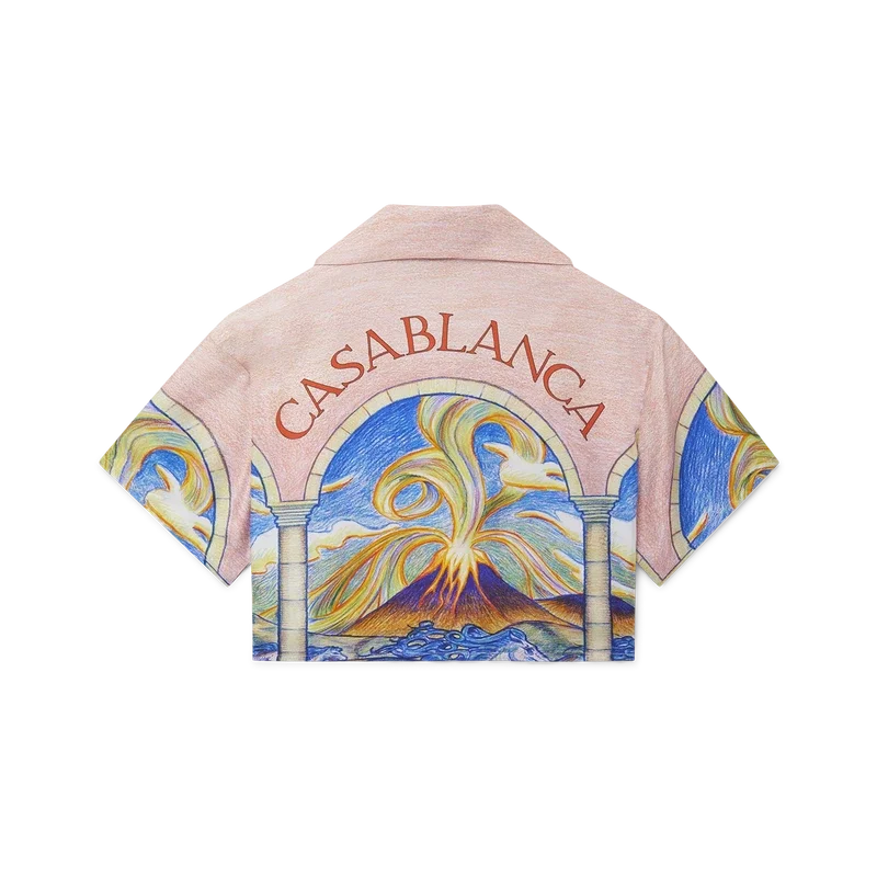 Den korte silkeskjorten fra Chevaux Sauvages har et sesongbetont trykk fra Futuro Optimisto-kolleksjonen. Den har en utvidet krage og knappestenging, og er ment å bæres åpen.