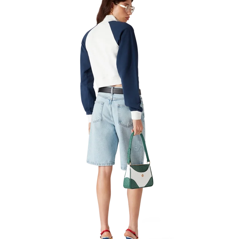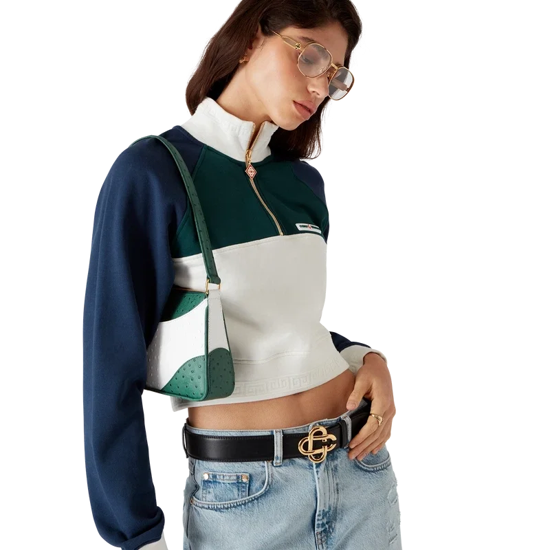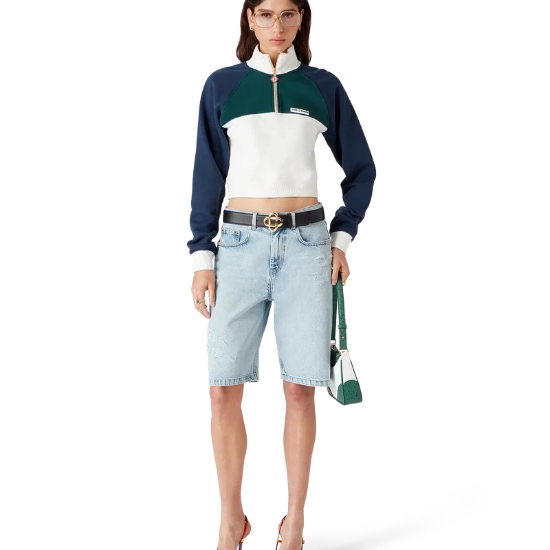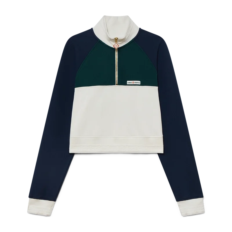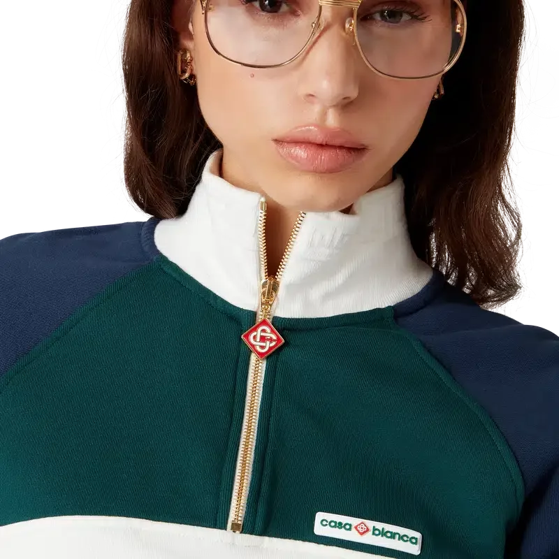 Den fargede, korte genseren med kvart glidelås er et sportsplagg med lange ermer, laget av økologisk bomull. Den er utstyrt med husets Casablanca-logo, fargede paneler, ribbestrikket krage, mansjetter og nederkant med stripete detaljer.