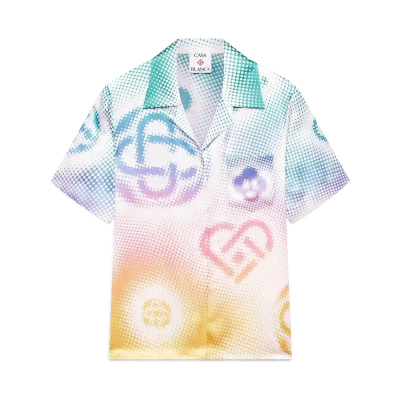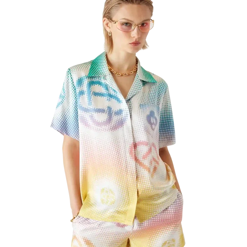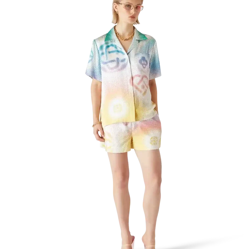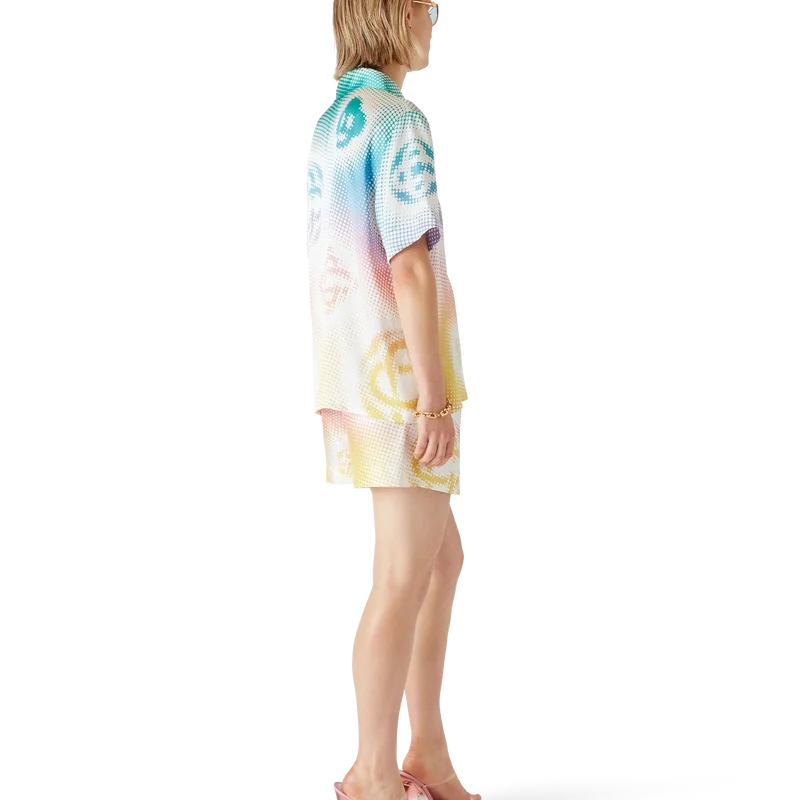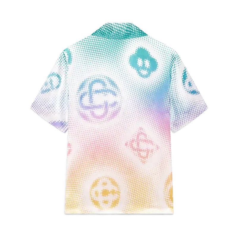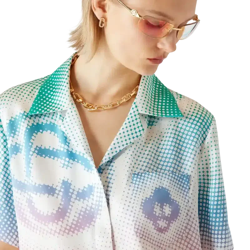 Halftone Logo-skjorten med korte ermer har et heltrykt design med kunstverk av husets monogrammer laget med airbrush, basert på våre tidligere eksperimenter med teknikken. Fullført med kubansk krage, knappelukking, brystlomme og sammenflettede Cc-logo-knapper i corozo.
