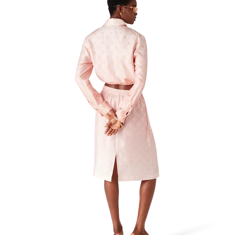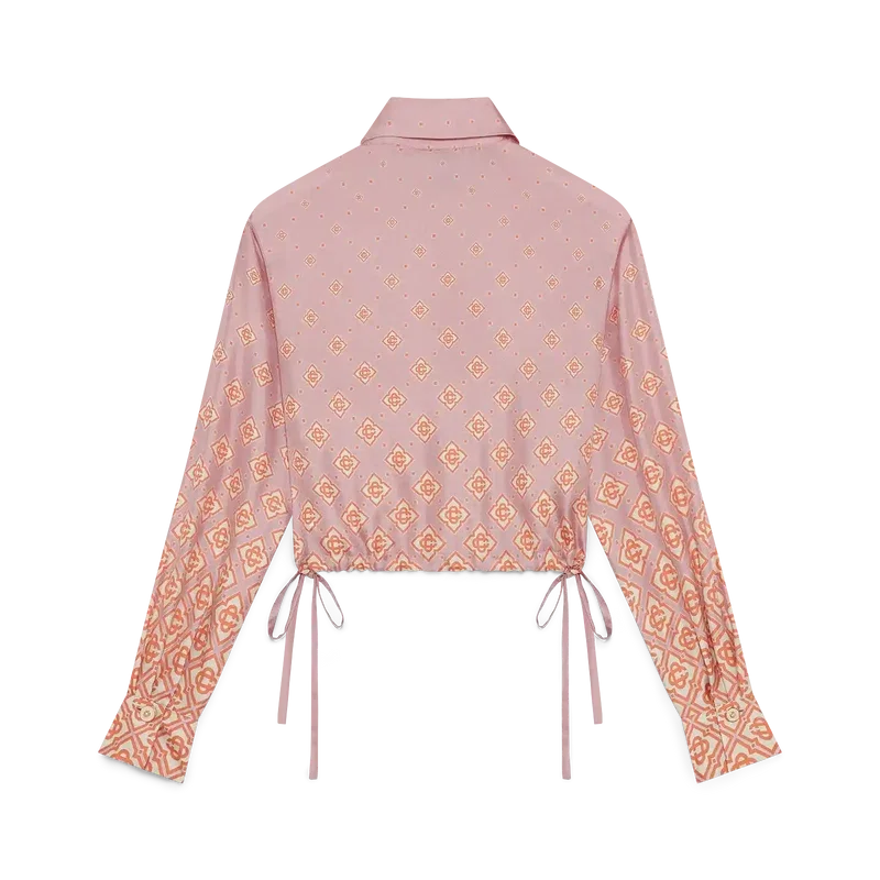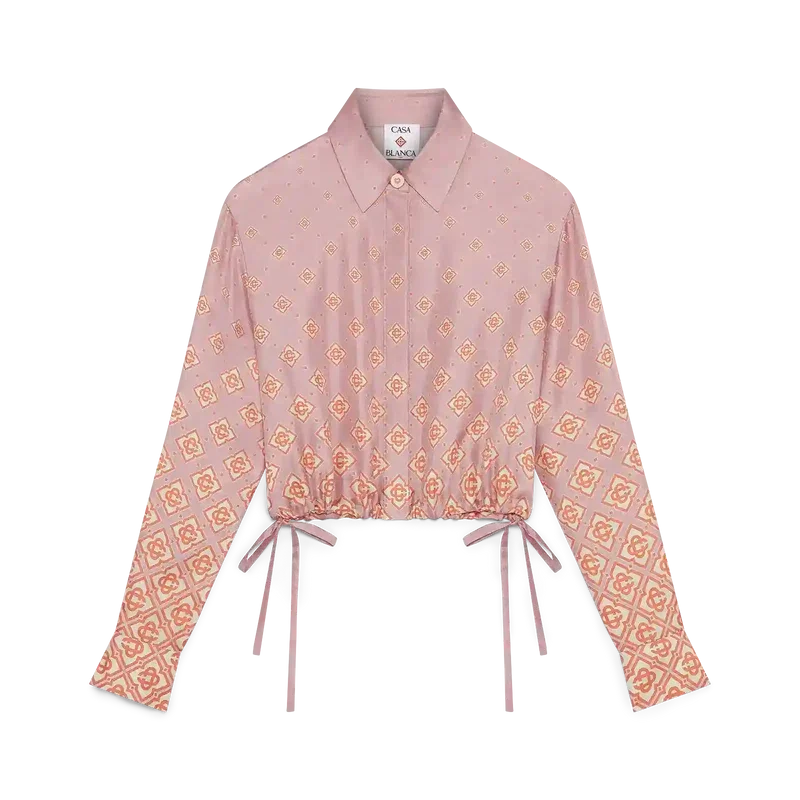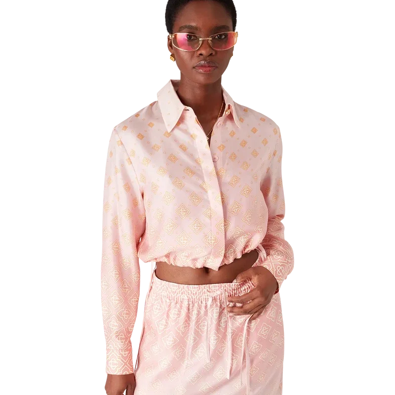 Den langermete silke-skjorten med Degrade-monogram har et kort design og er laget av silketwill, med husets monogram i gradientfarger. Den har spiss krage, knappestenging, Corozo-knapper med sammenflettet CC-logo, karakteristiske gullkantede perleknapper på mansjetter og krage, snørebånd i sidene og en kort silhuett.