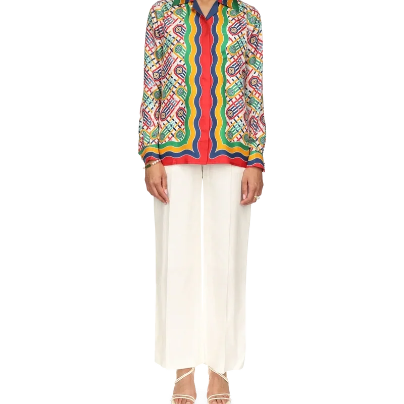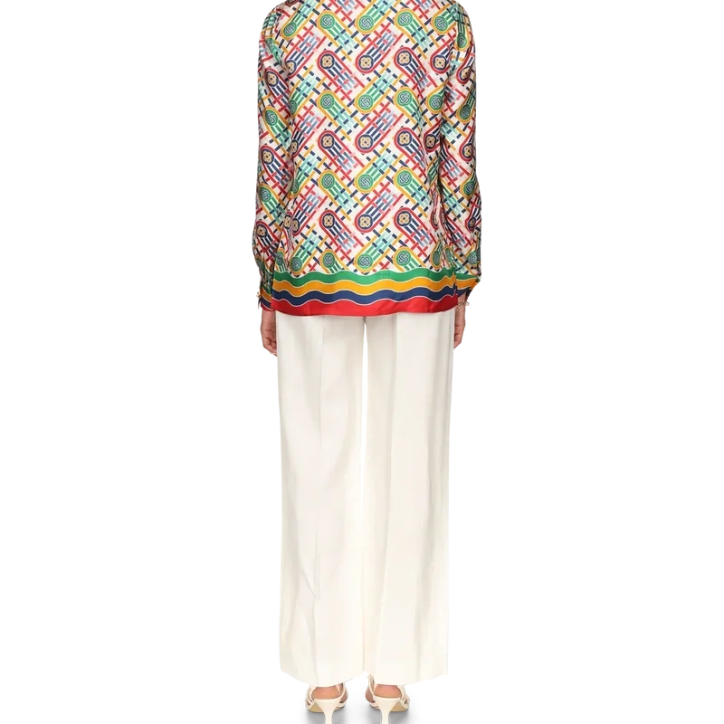 Tennis-monogram-silkeskjorte med lange ermer for kvinner har husets signaturdesign, nyfortolket for den eksklusive Nordstrom-kolleksjonen med fokus på moderne tennisinspirert athleisure.