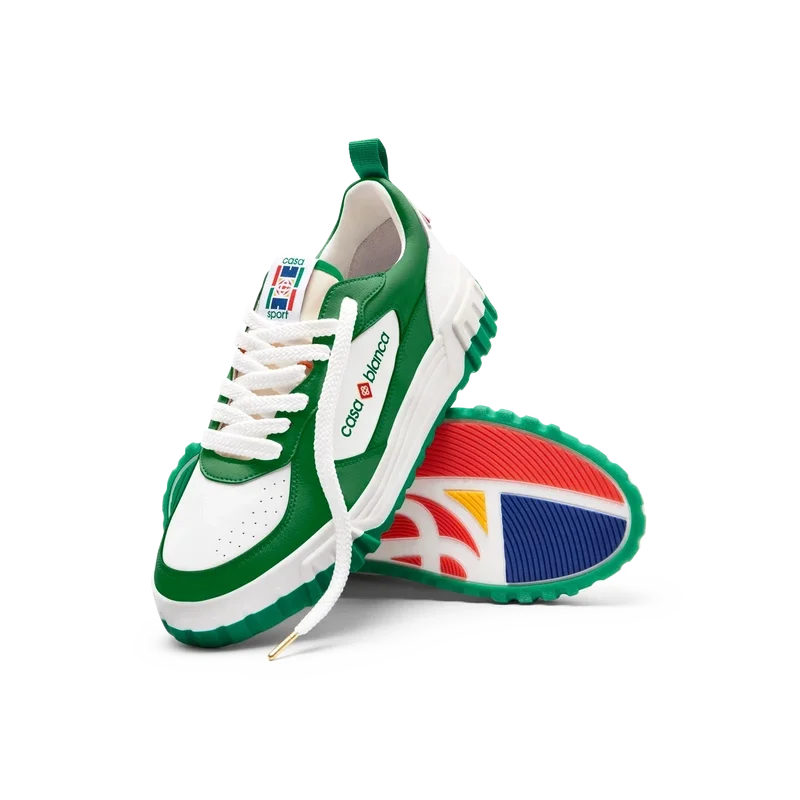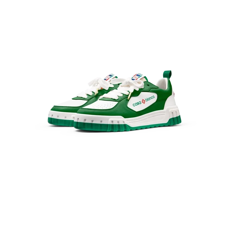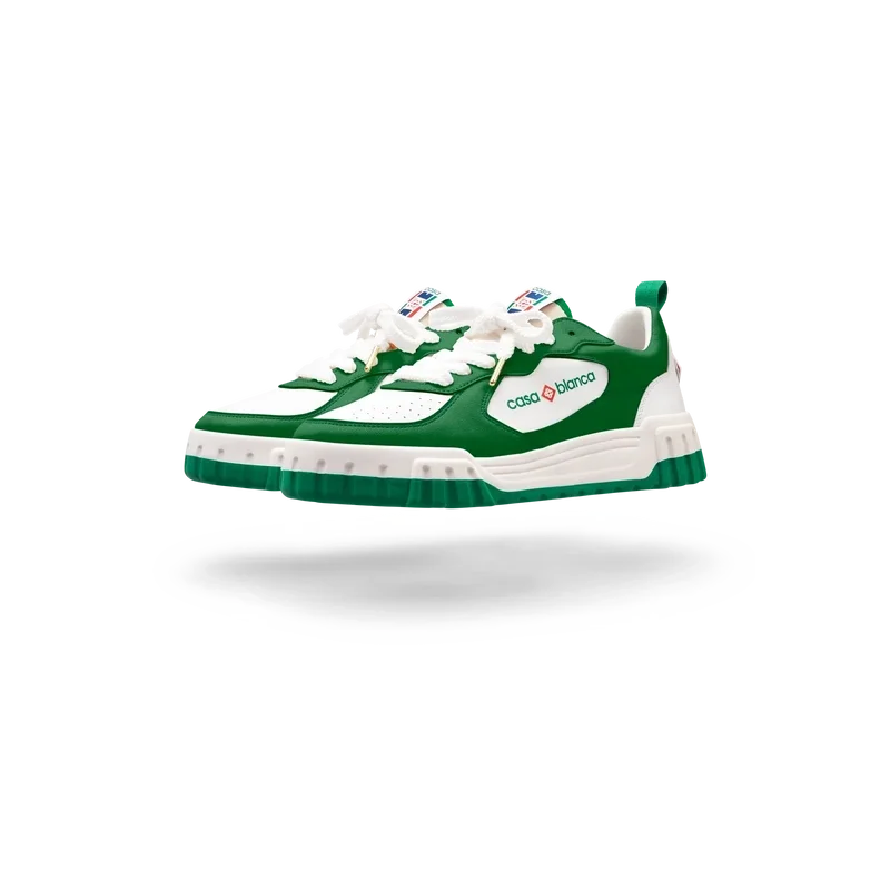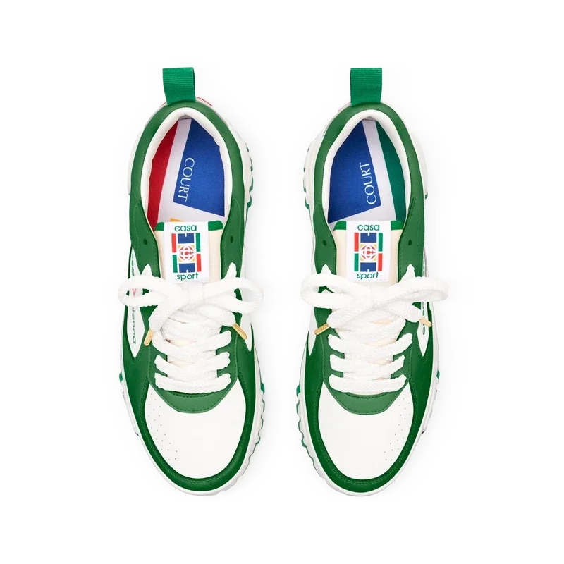 Det fremtredende Casablanca-merket er tydelig overalt, inkludert merkets signaturdiamantmotiv på hælen, silikonordmerke på sidene og det vevde tennissbanemotivet på tungeetiketten og innersålen, noe som gir opphav til navnet, The Court.