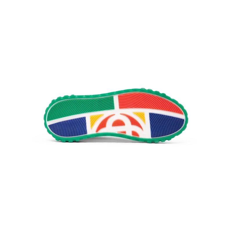 Fargene som preger gummisålen er en kombinasjon av raffinerte koder fra tennis og klassisk arkitektur, og skaper en helhetlig fargepalett i hele skoen, med fokus på primær- og sekundærfarger som kontrasteres av tennis-hvitt for å skape en sportsfokusert fargehistorie.