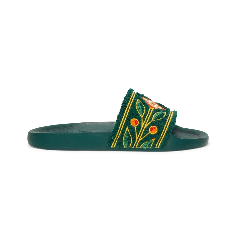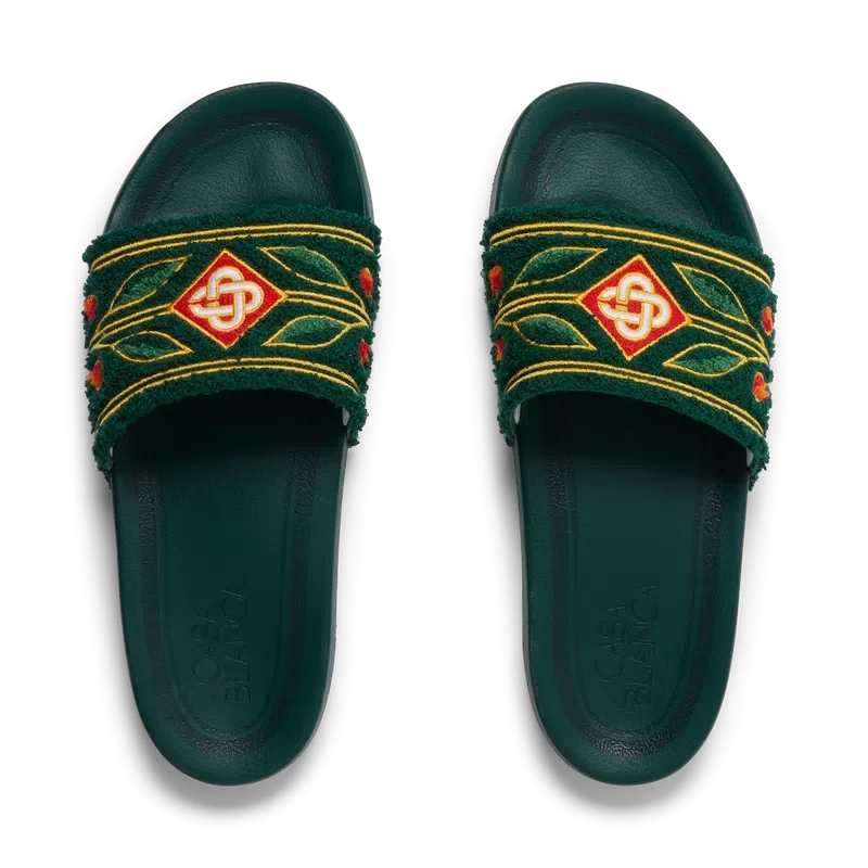 Laurel Terry-tøflene er laget av brodert frotté og har husets diamantlogo og karakteristiske Laurel-motiv på overdelen. De er utstyrt med myke og fleksible, polstrede gummiaktige såler.