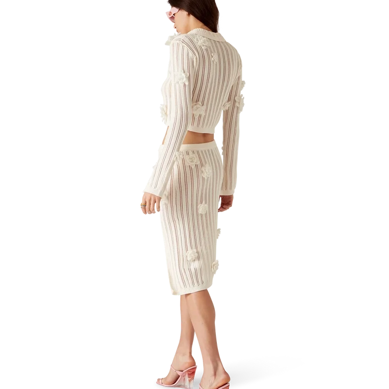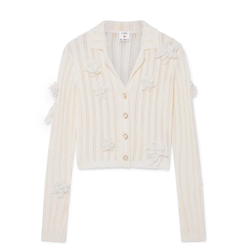 Blomsterbluse i blonderstrikk er en langermet modell laget av bomullsstoff i blonderstrikk. Utført med klokkeermer med spaltedetaljer, krage, knappestenging, karakteristiske gullkantede perleknapper og applikasjoner med blomstermotiv.