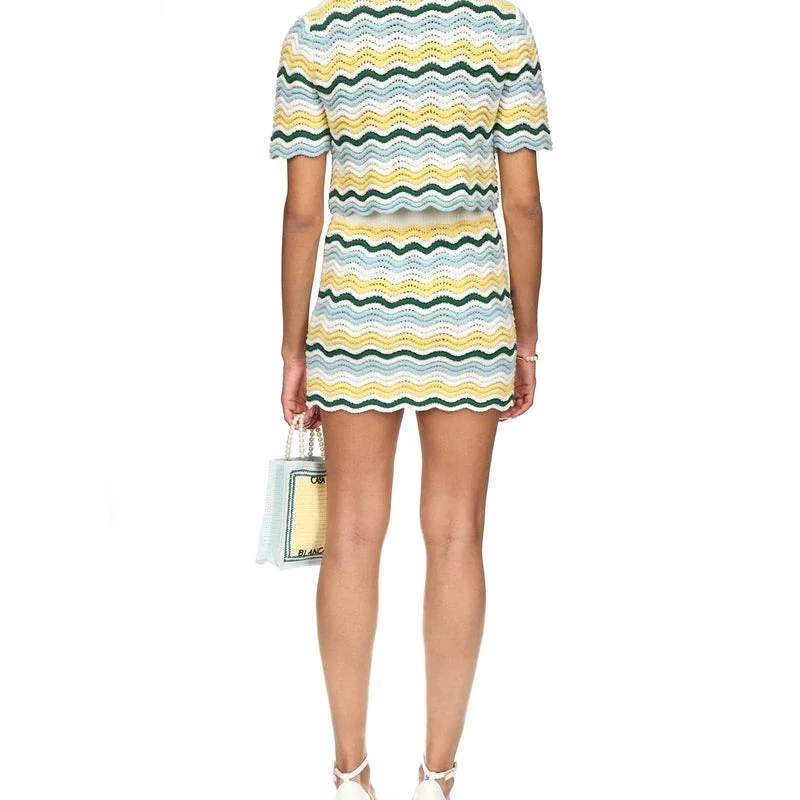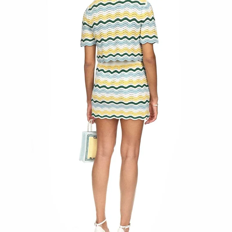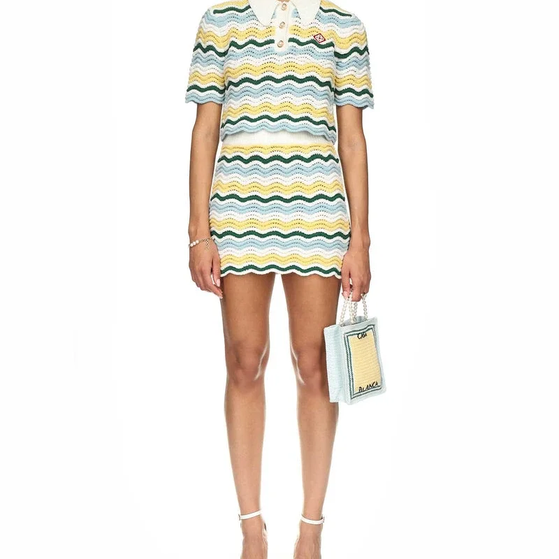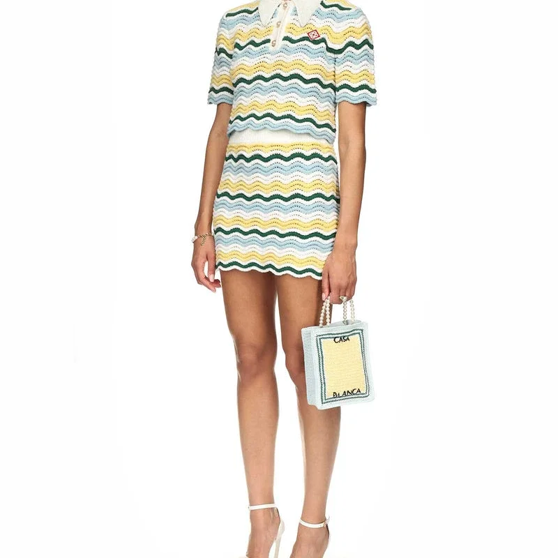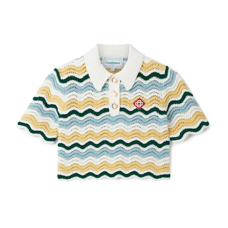 Boucle Wave Top er en kortærmet signaturmodell i Casablanca-stil, laget av et mykt, strukturert heklet stoff med åpen veving, og har en hvit ribbestrikket krage og knappeliste. Den er ferdig med husets diamantlogo og Casablanca Paris-merkelapp, og strikken i en blanding av bomull og nylon er designet for å ha en slim fit.