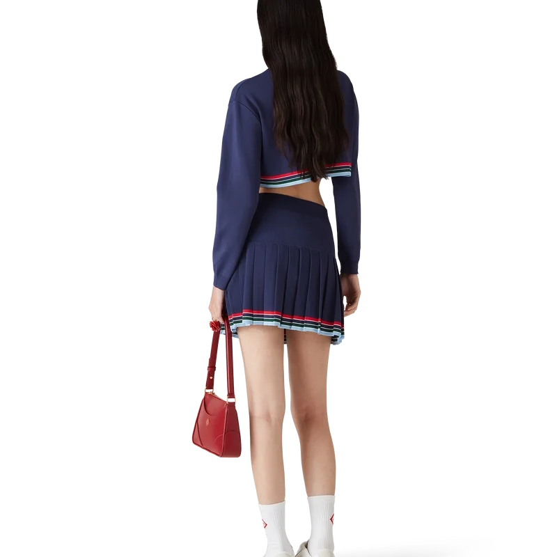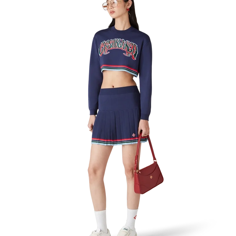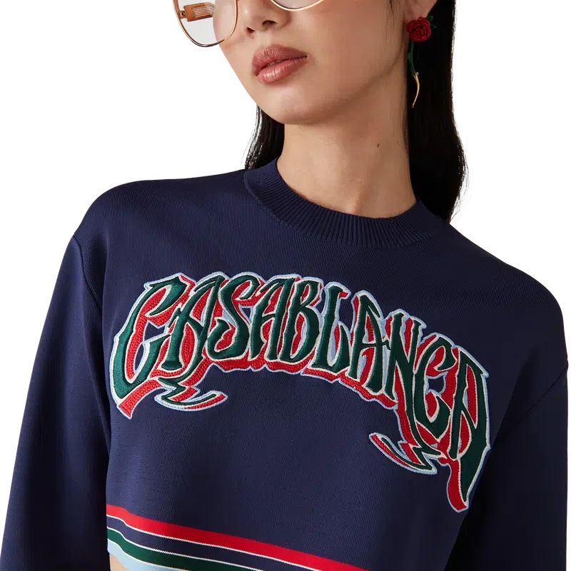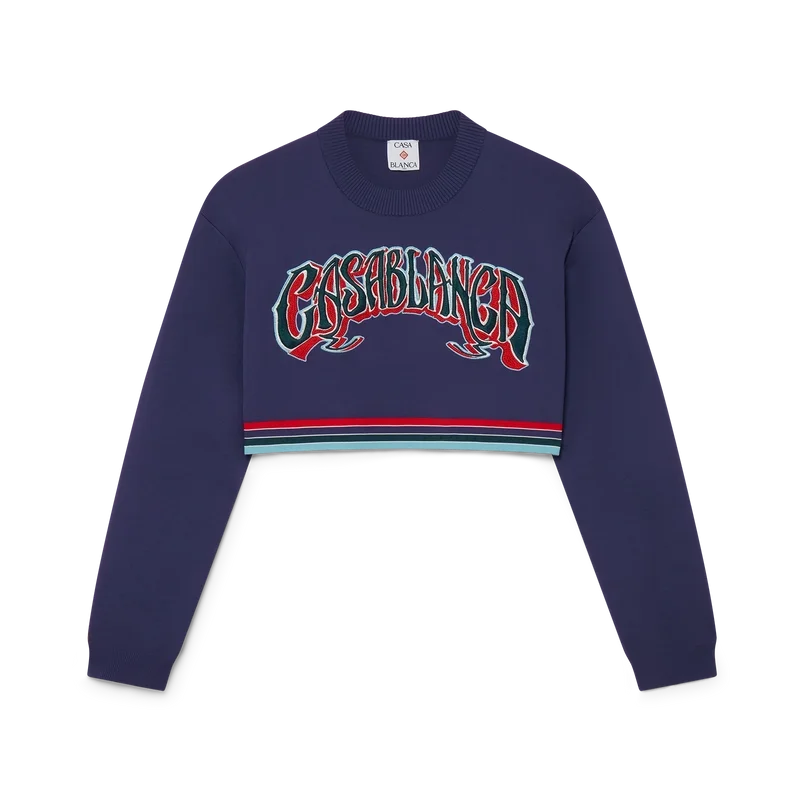 Den korte baseball-genseren er laget av trikotstoff og har brodert, håndtegnet typografi av Casablanca-logoen, inspirert av den gotiske skrifttypen som brukes i tatoveringer. Fullført med ribbestrikket krage og mansjetter, samt horisontale striper i rødt, hvitt, blått, grønt og marineblått nederst på genseren.