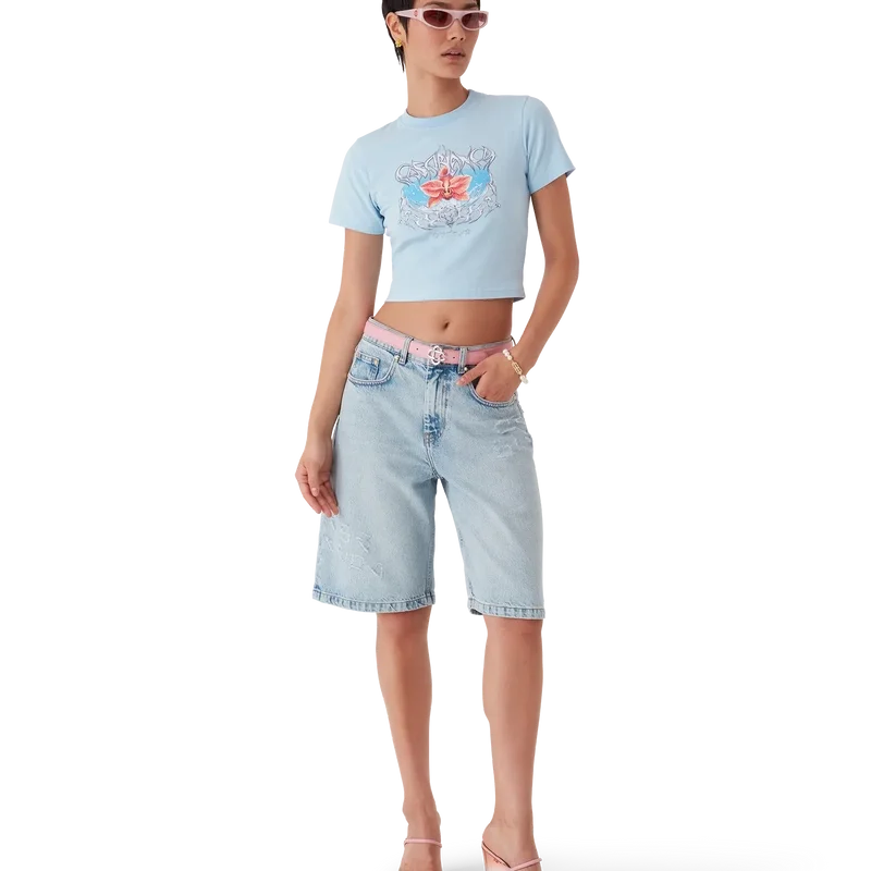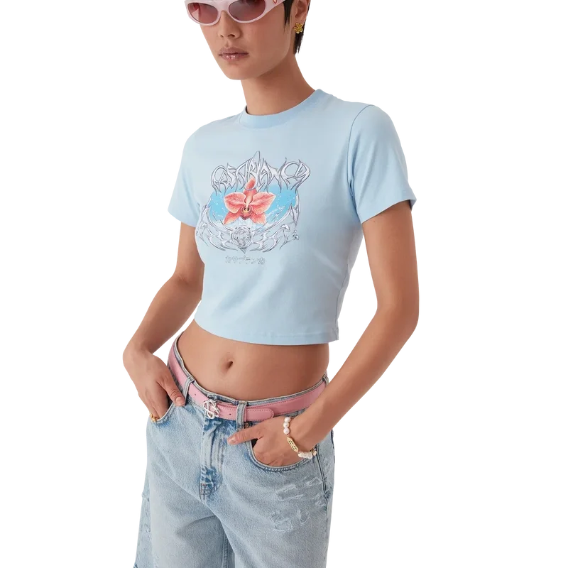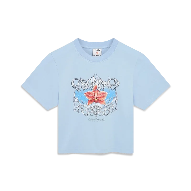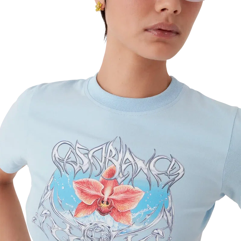 Blades kort T-skjorte er en tettsittende, trykt modell med et motiv som leker med kontrasten mellom to motstridende følelser – skarpheten til bladet og den kalde, sølvfargede kromen, i kontrast til naturens varme, som de dristige rosa og røde tonene i en orkide. Tilsetningen av vann gir designet et friskt, sprøtt element. Fullført med en klassisk rund hals.
