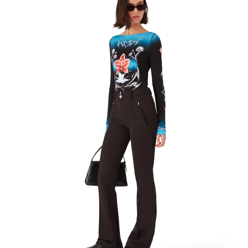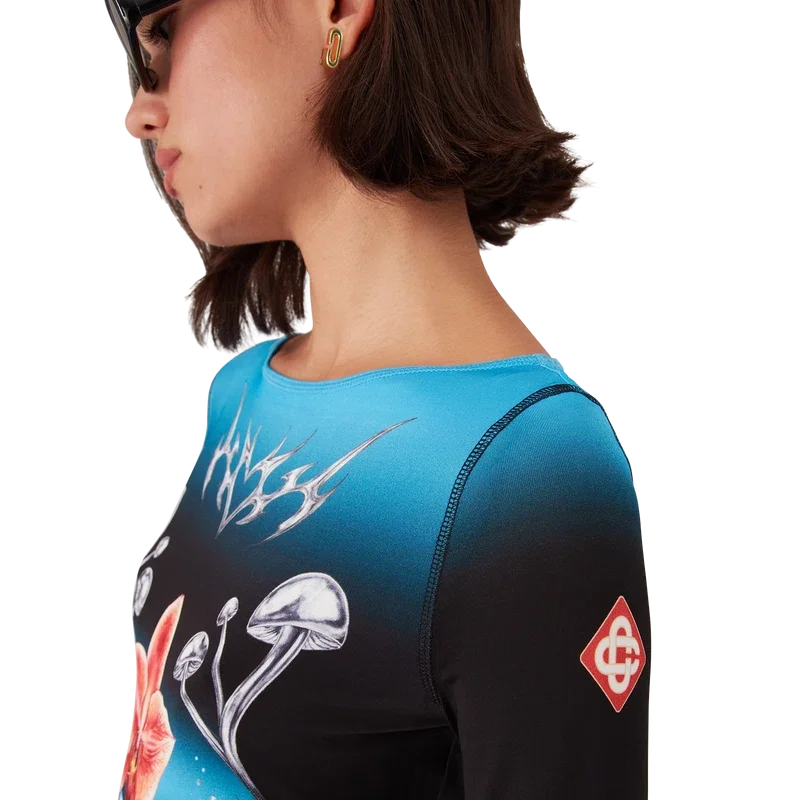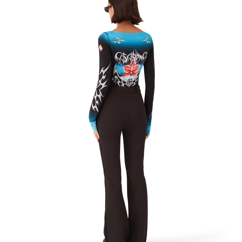 Blades langermet topp har et trykt design med sesongens Blades-kunstverk som leker med kontrasten mellom to motstridende følelser – skarpheten til bladet og det kalde, sølvfargede kromet, i kontrast til naturens varme, som de dristige rosa og røde tonene i en orkideblomst. Tilsetningen av vanndråper gir designet et friskt og sprøtt element. Fullført med båthals, stripete mansjetter og husets signaturdiamantlogo på ermene.